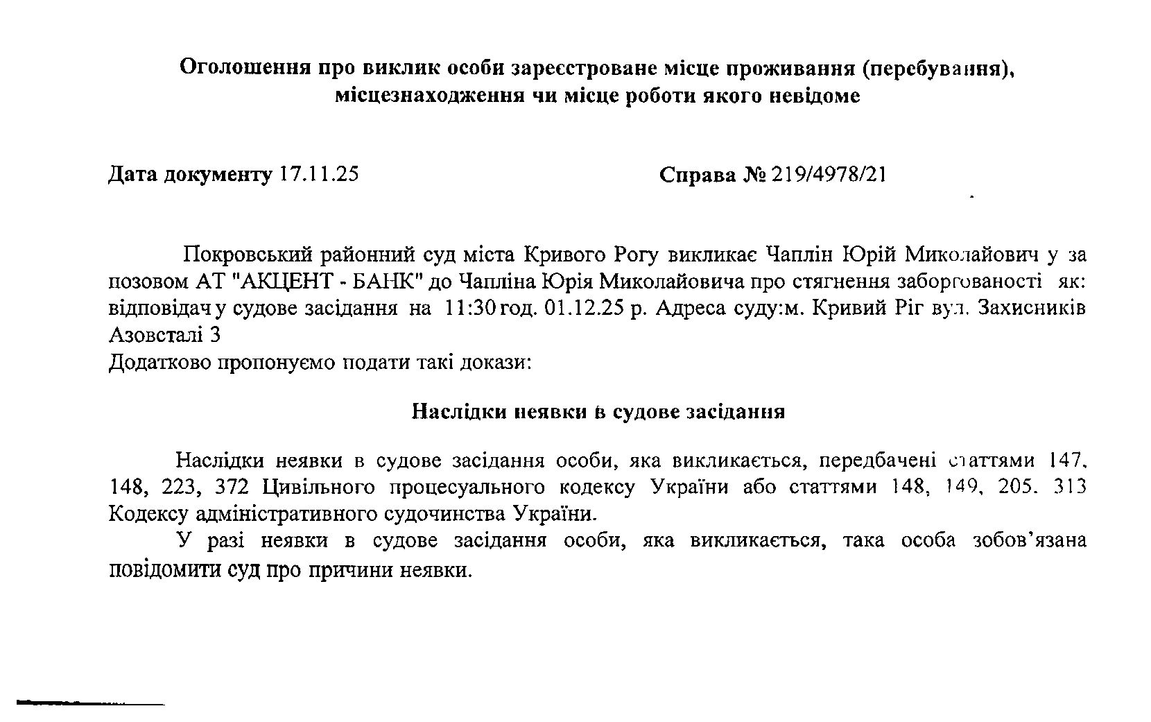 Оголошення про виклик до суду Чапліна Юрія Миколайовича