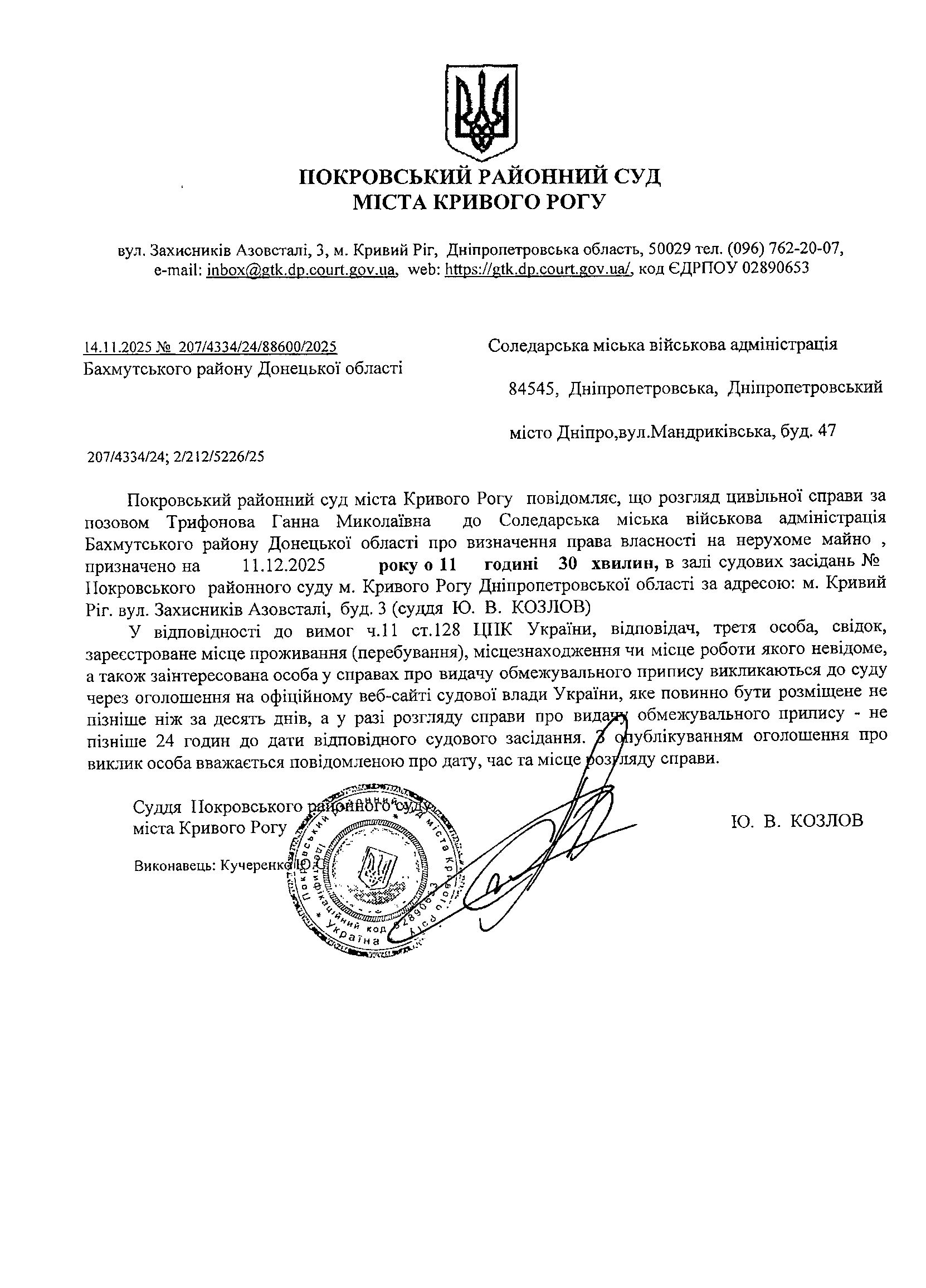 Оголошення про виклик до суду Соледарської міської військової адміністрації