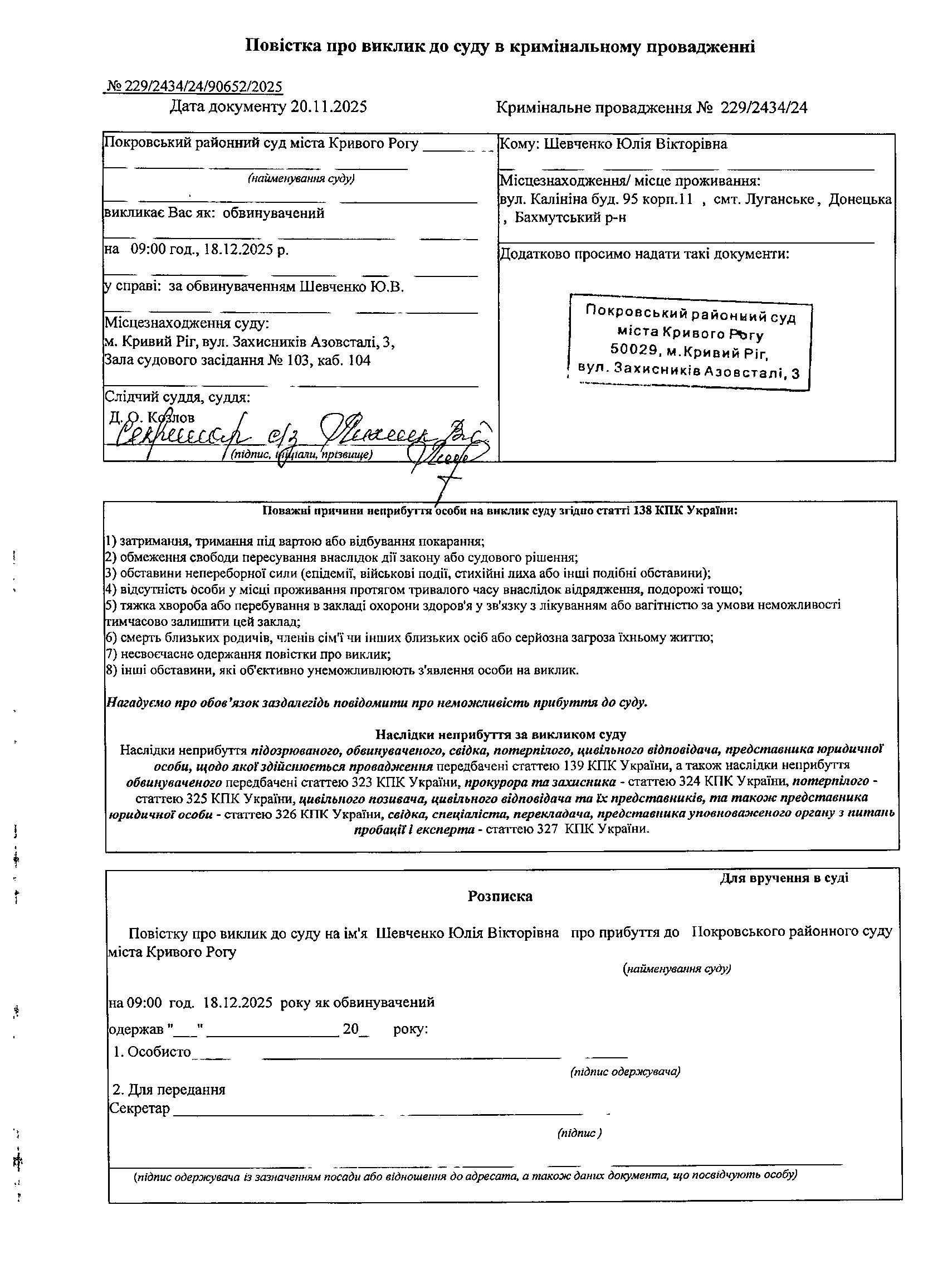 Оголошення про виклик до суду Шевченко Юлії Вікторівни