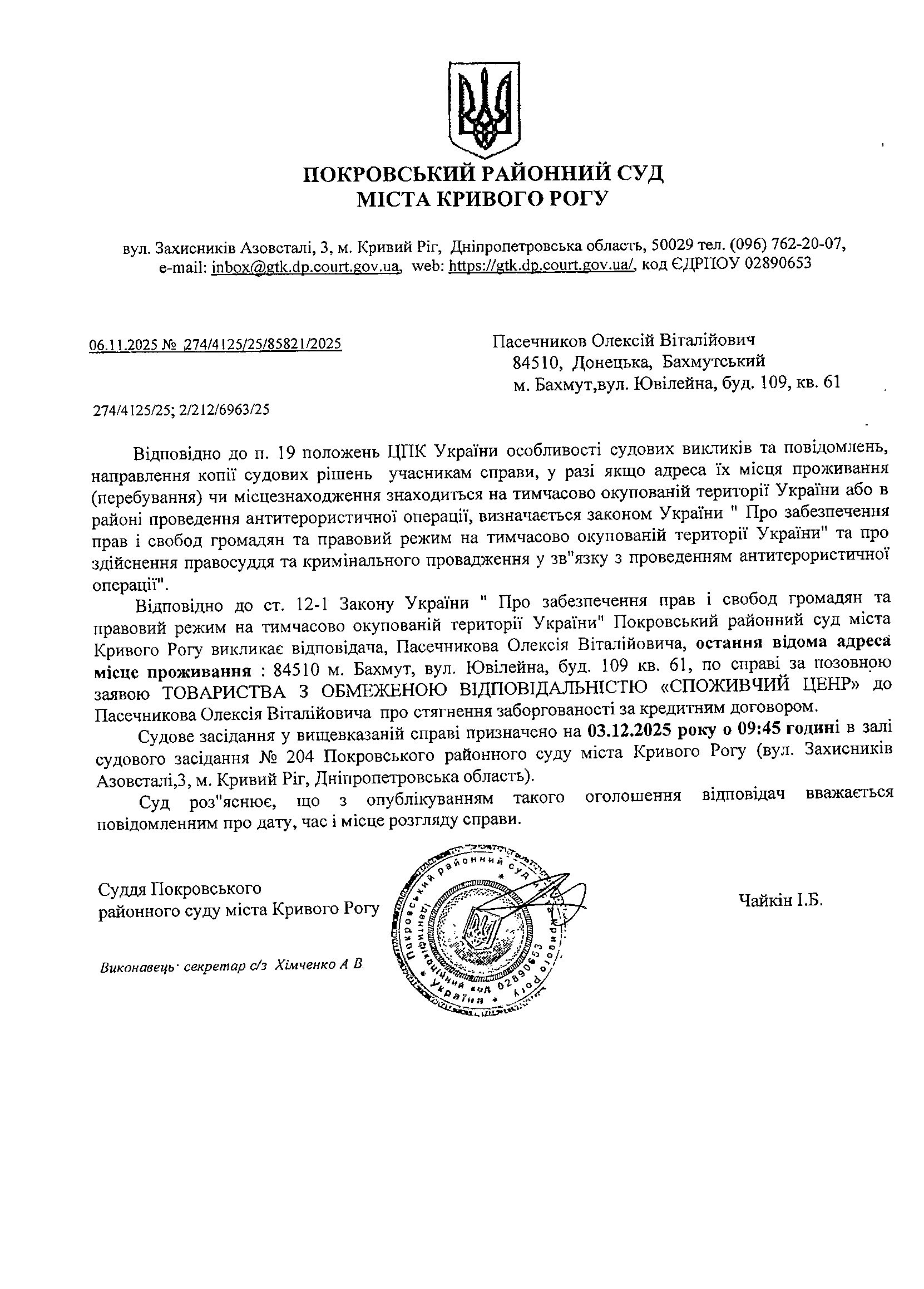 Оголошення про виклик до суду Пасечникова Олексія Віталійовича