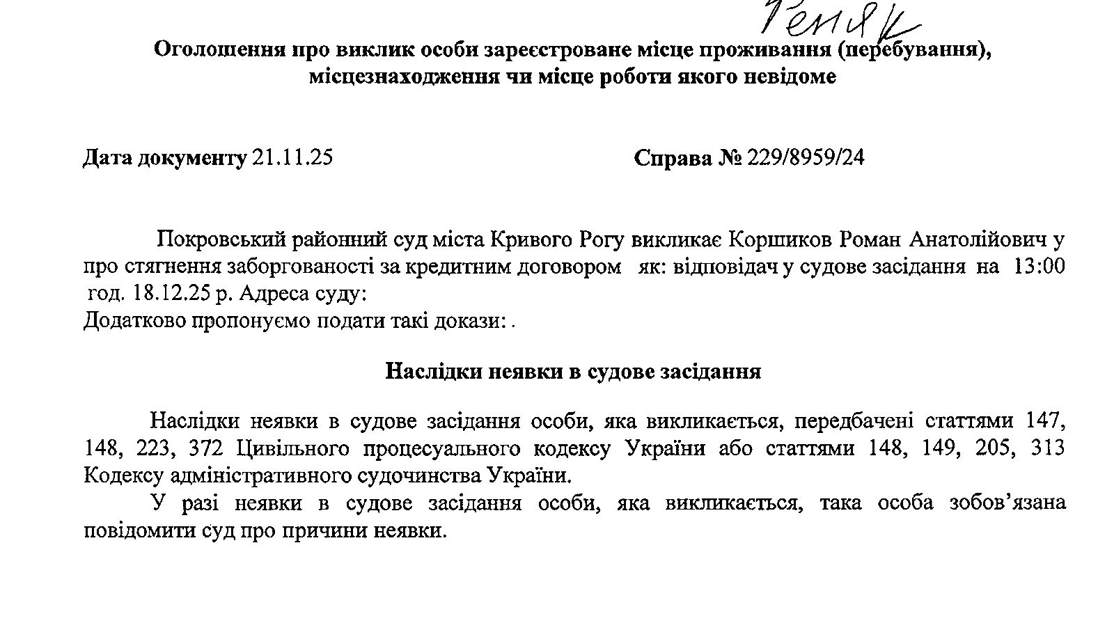Оголошення про виклик до суду Коршикова Романа Анатолійовича