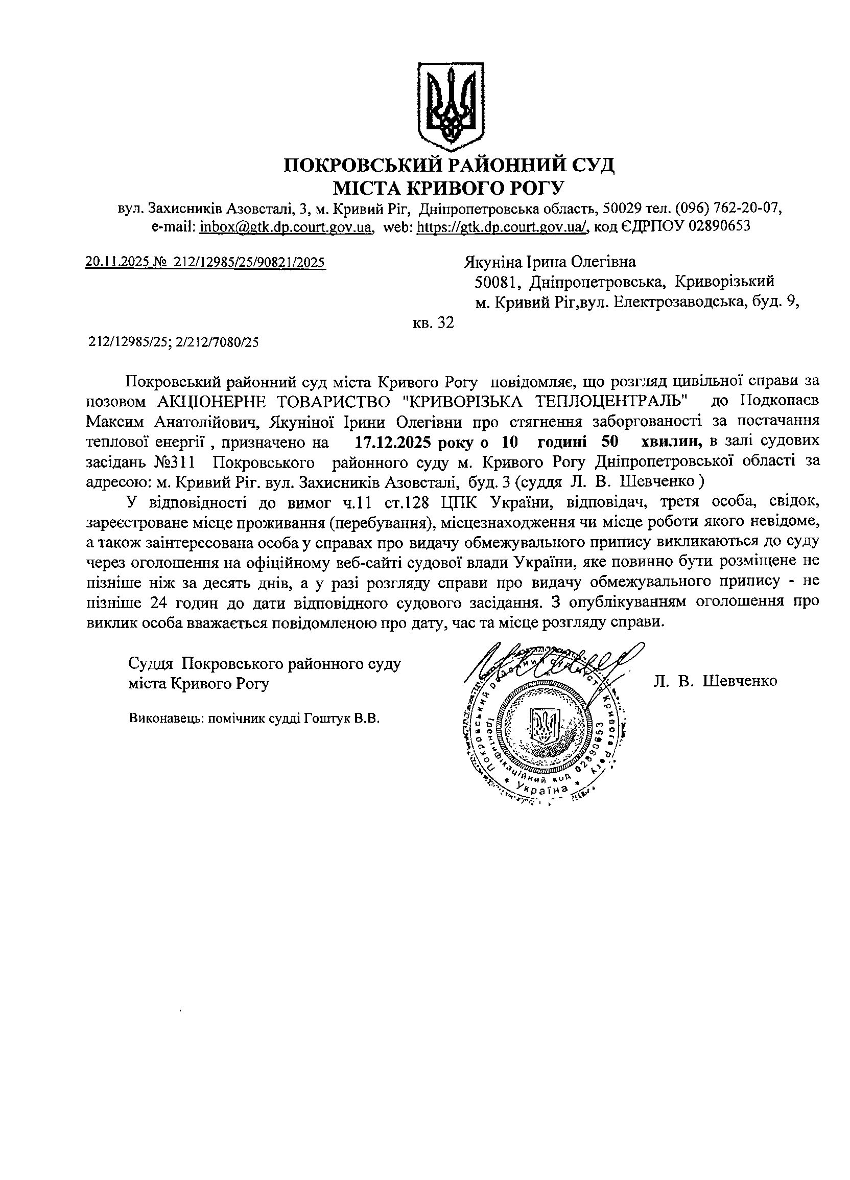 Оголошення про виклик до суду Якуніної Ірини Олегівни