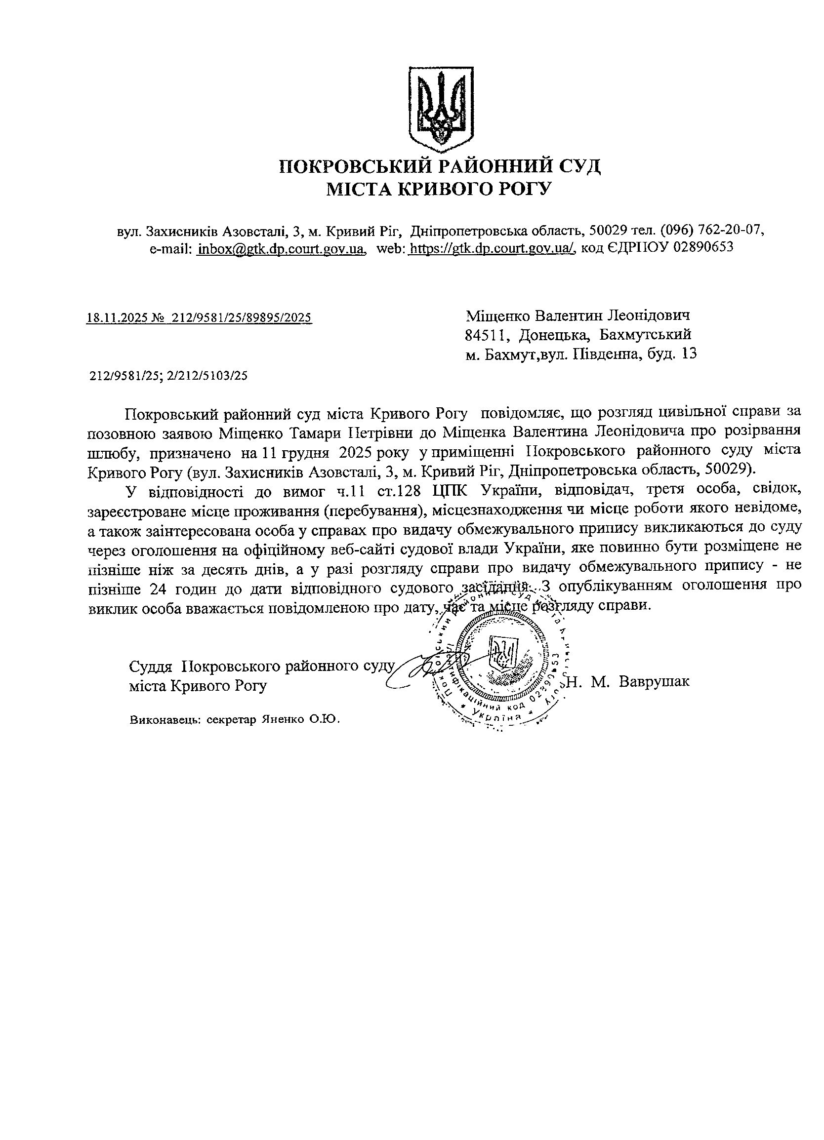 Оголошення про виклик до суду Міщенка Валентина Леонідовича