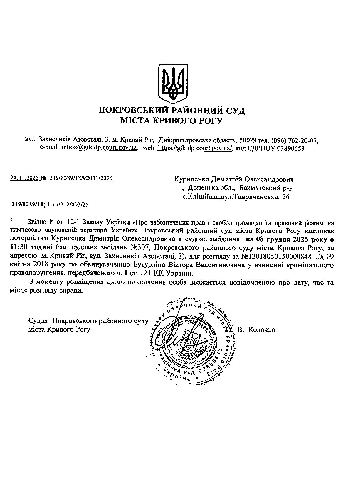 Оголошення про виклик до суду Куриленка Димитрія Олександровича