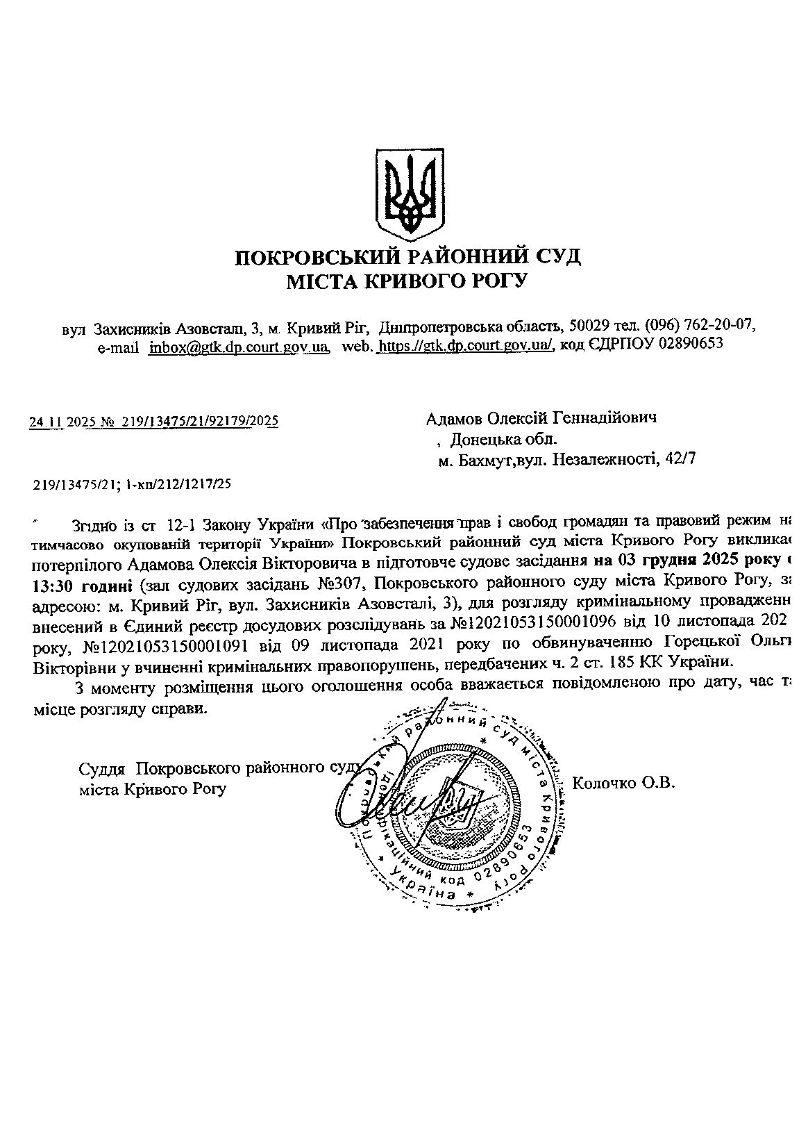 Оголошення про виклик до суду Адамова Олексія Геннадійовича