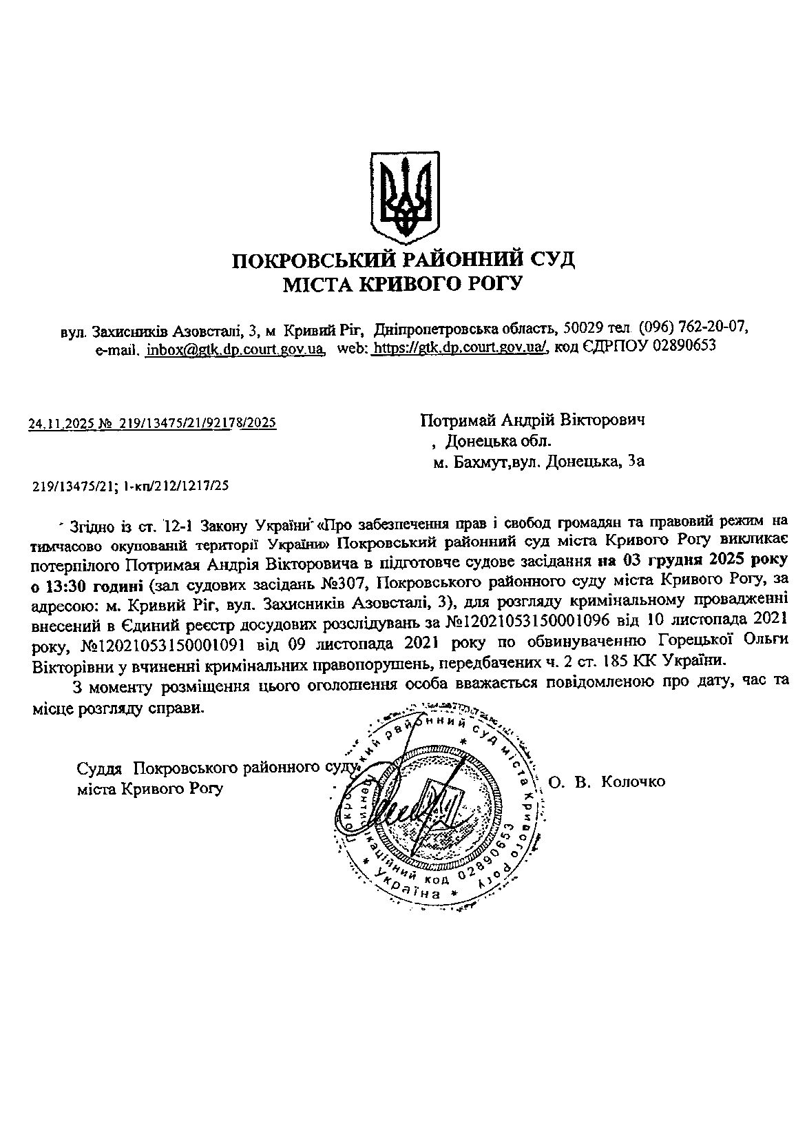 Оголошення про виклик до суду Потримая Андрія Вікторовича