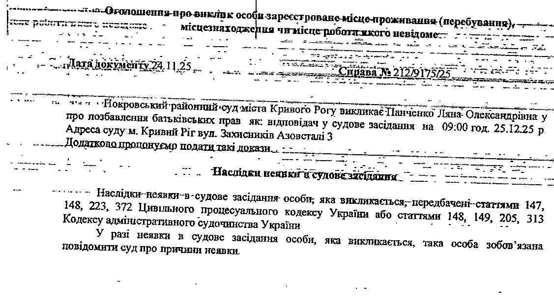 Оголошення про виклик до суду Панченко Ляни Олександрівни