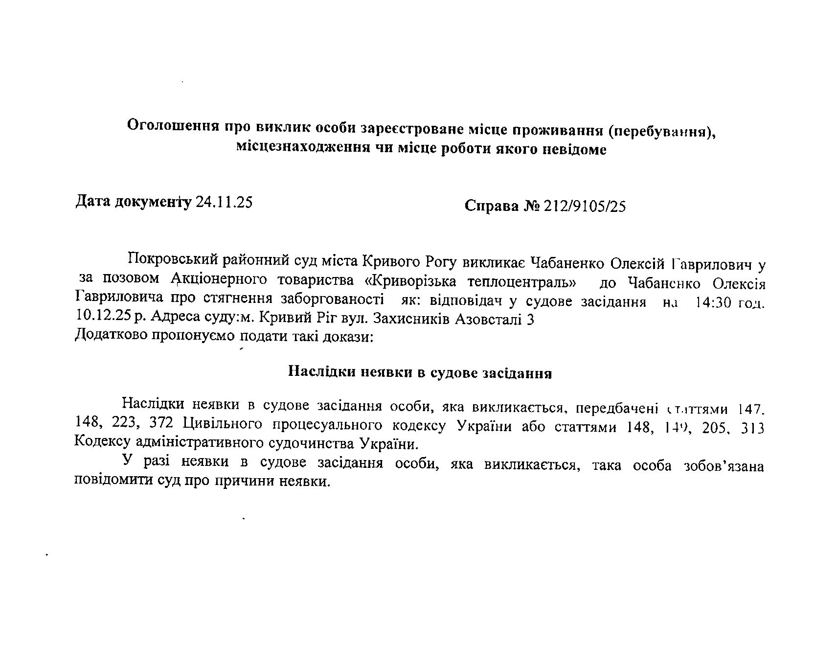 Оголошення про виклик до суду Чабаненка Олексія Гавриловича