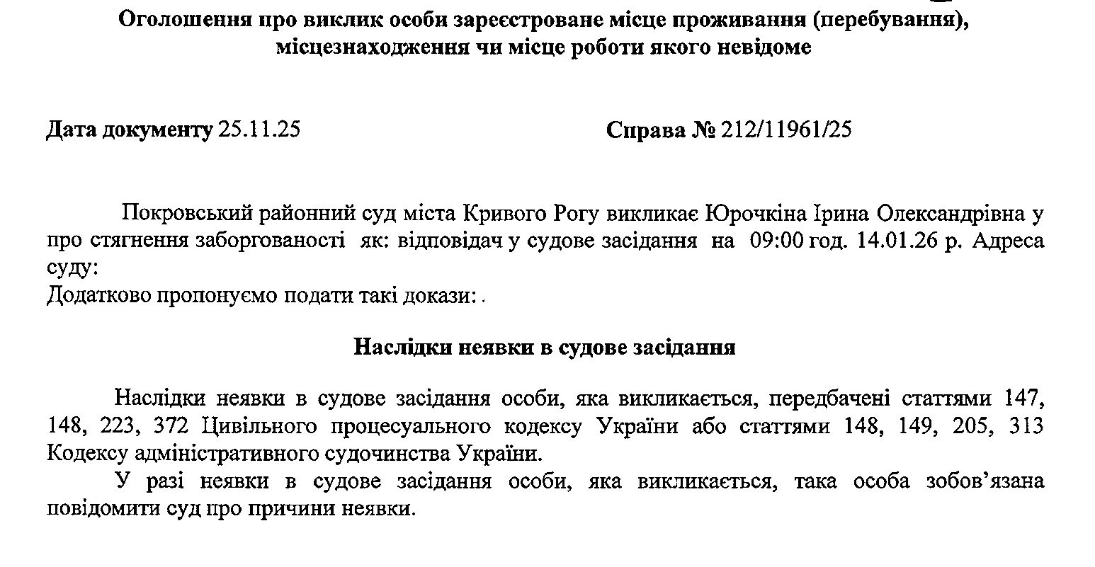 Оголошення про виклик до суду Юрочкіної Ірини Олександрівни