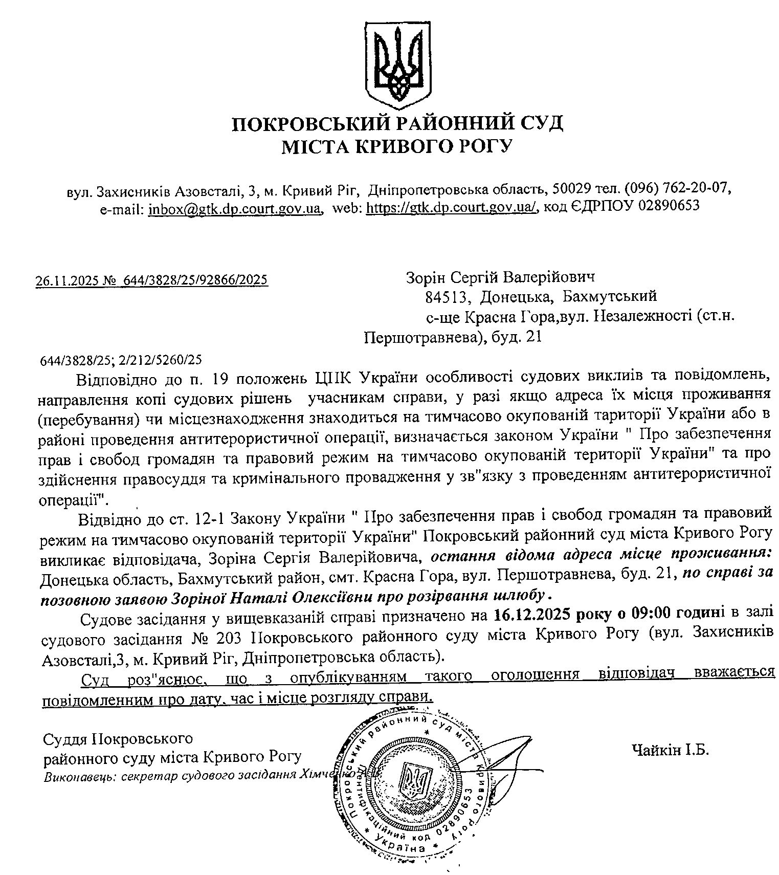Оголошення про виклик до суду Зоріна Сергія Валерійовича