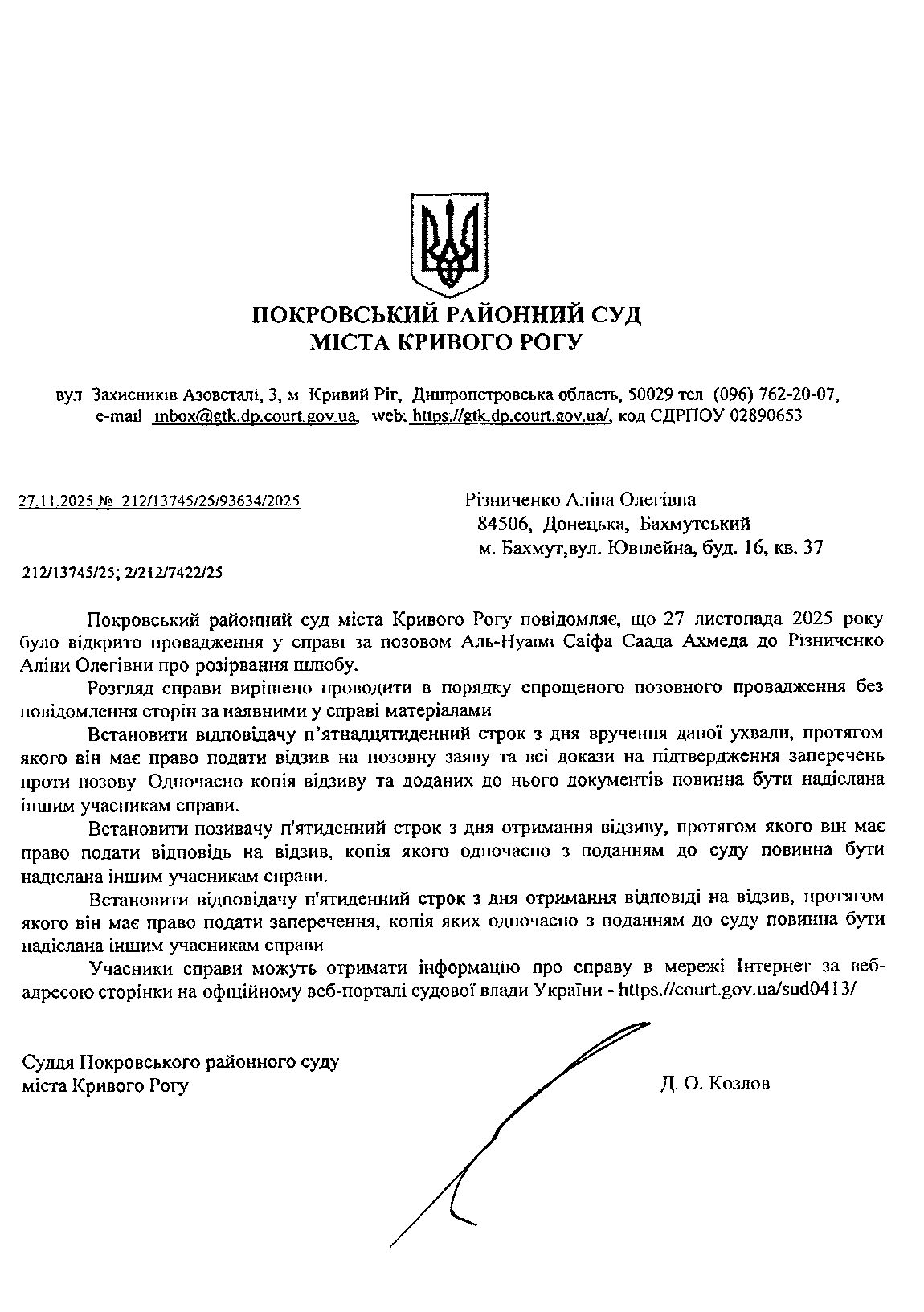 Оголошення про виклик до суду Різниченко Аліни Олегівни