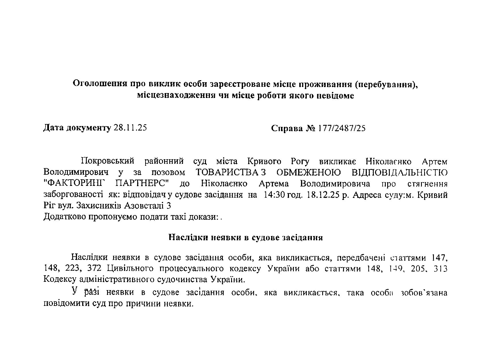 Оголошення про виклик до суду Ніколаєнка Артема Володимировича