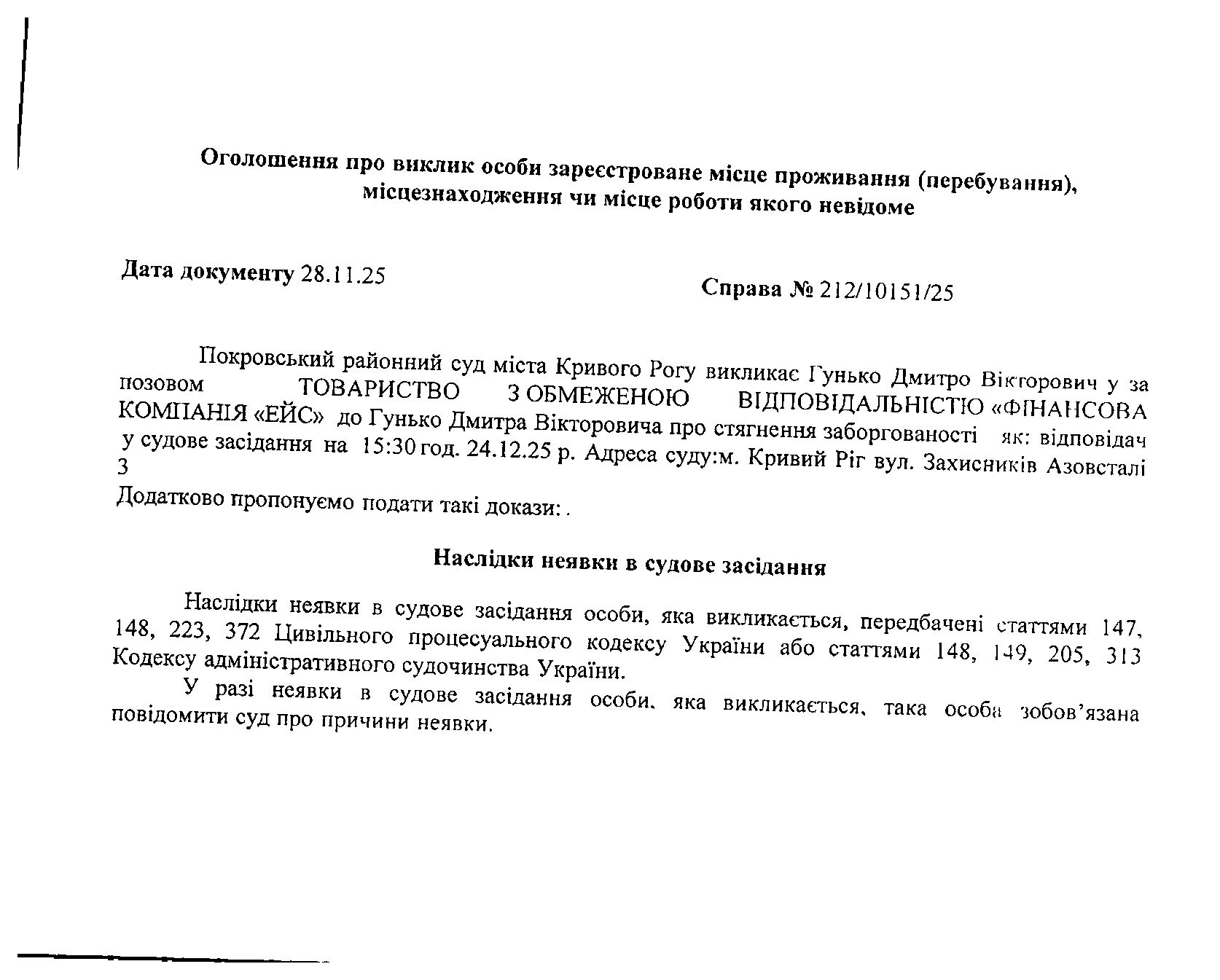 Оголошення про виклик до суду Гунька Дмитра Вікторовича