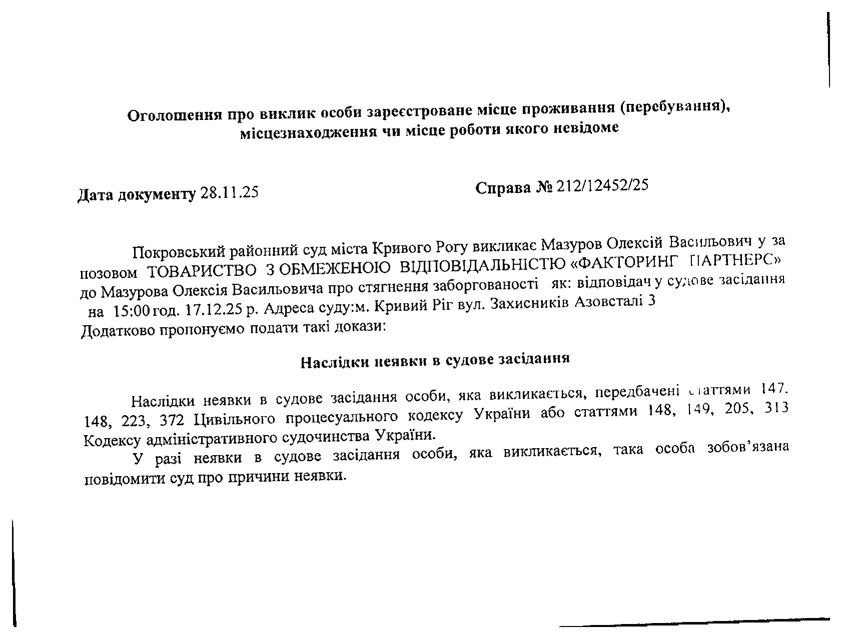 Оголошення про виклик до суду Мазурова Олексія Васильовича