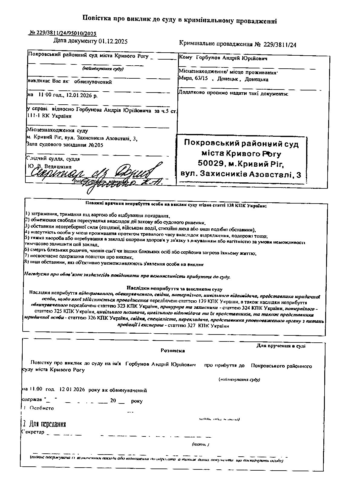 Оголошення про виклик до суду Горбунова Андрія Юрійовича