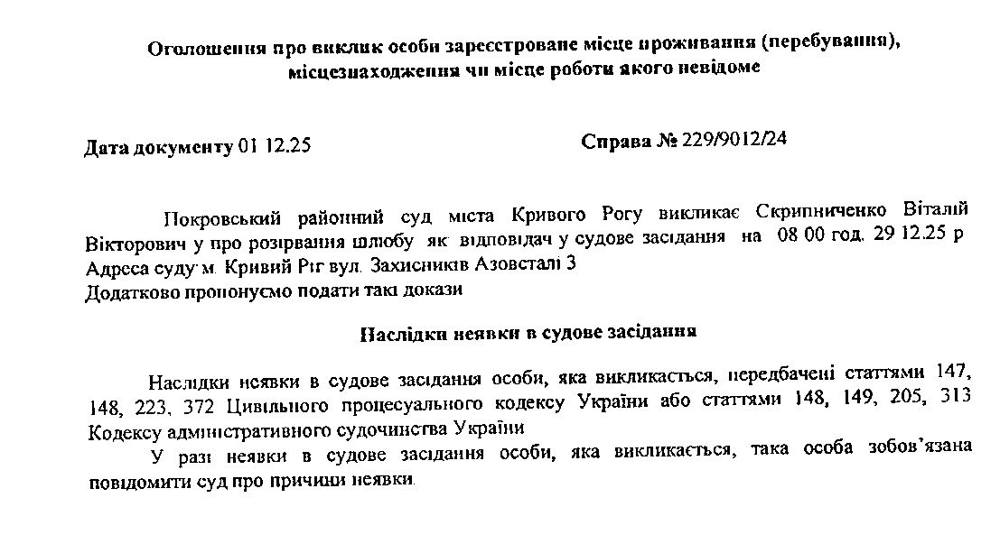 Оголошення про виклик до суду Скрипниченка Віталія Вікторовича
