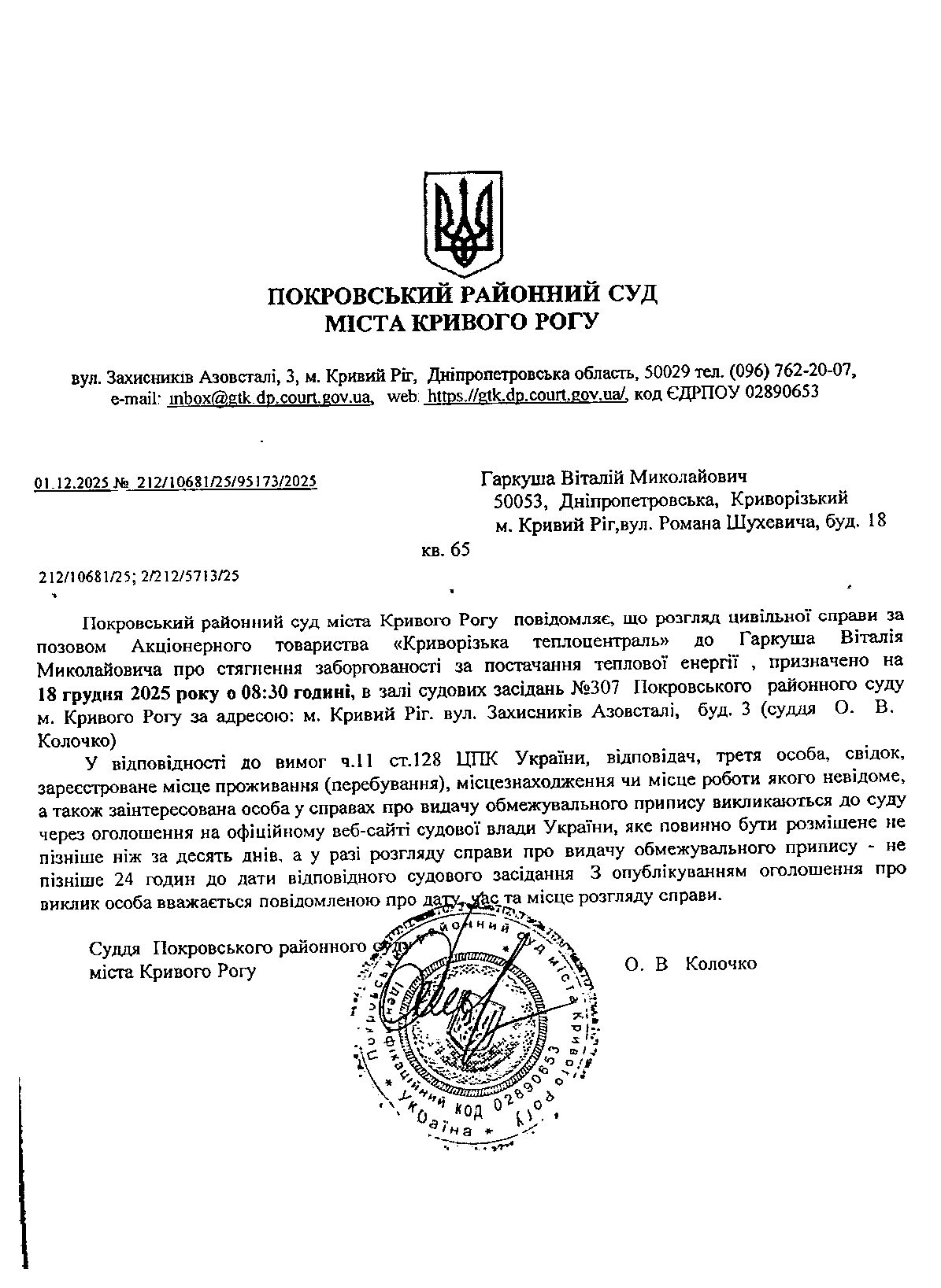 Оголошення про виклик до суду Гаркуші Віталія Миколайовича