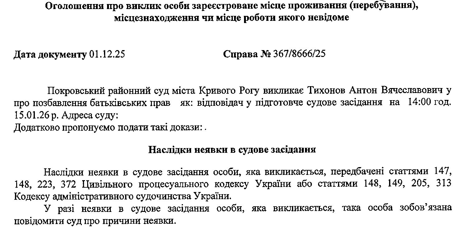 Оголошення про виклик до суду Тихонова Антона Вячеславовича