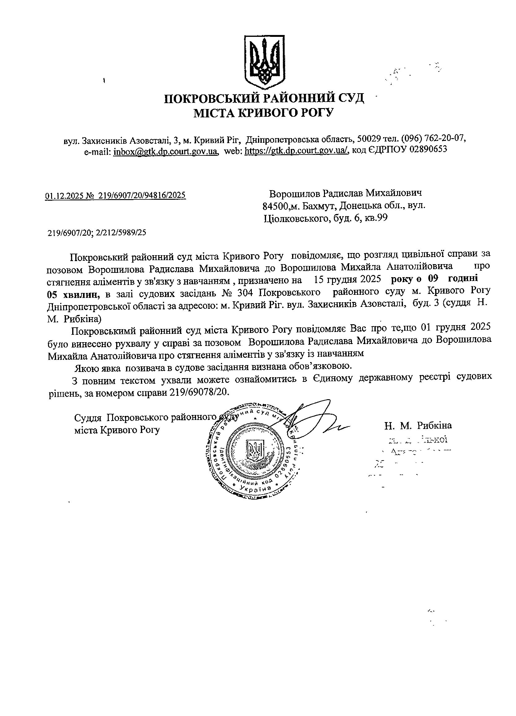 Оголошення про виклик до суду Ворошилова Радислава Михайловича