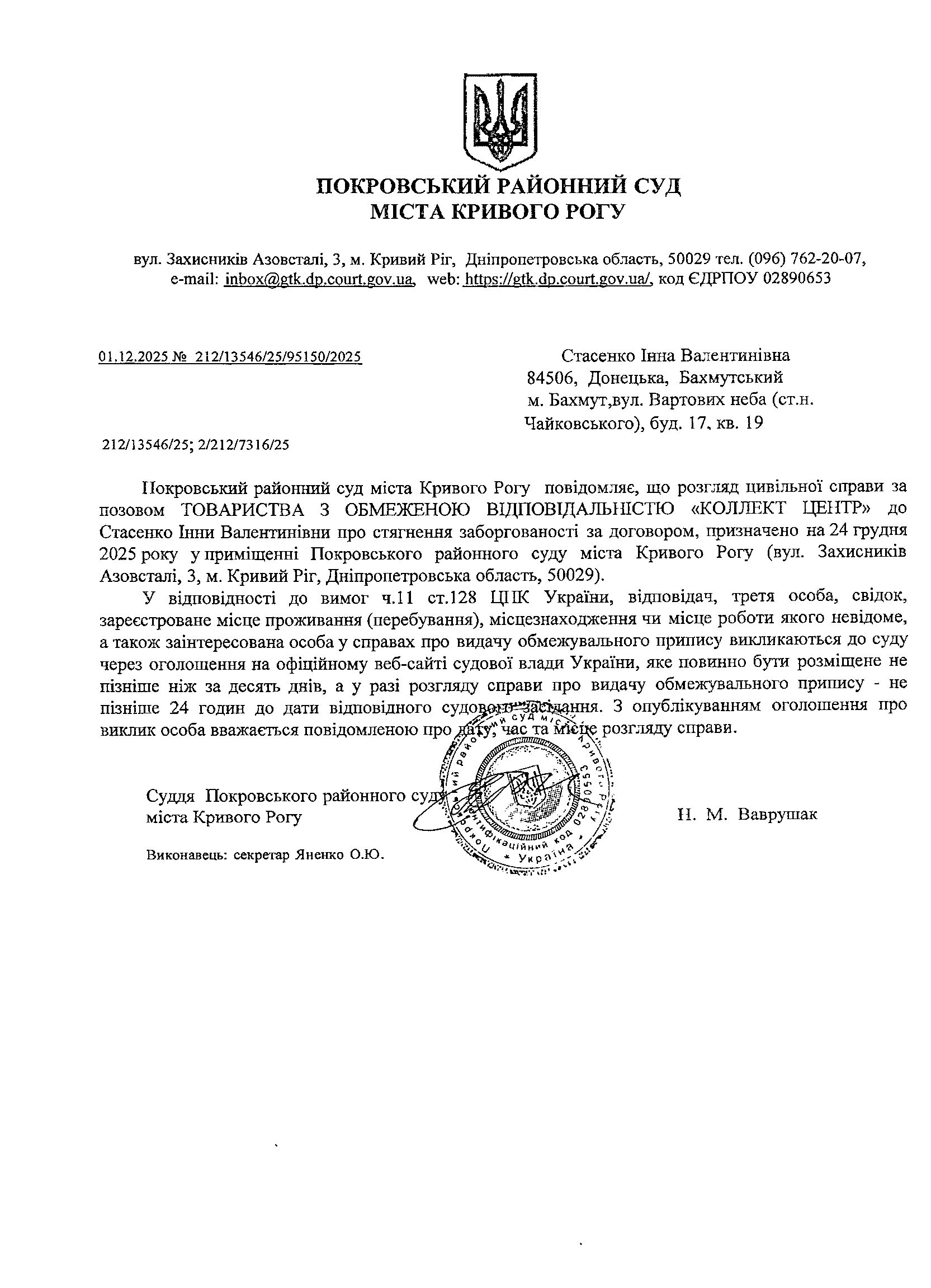 Оголошення про виклик до суду Стасенко Інни Валентинівни