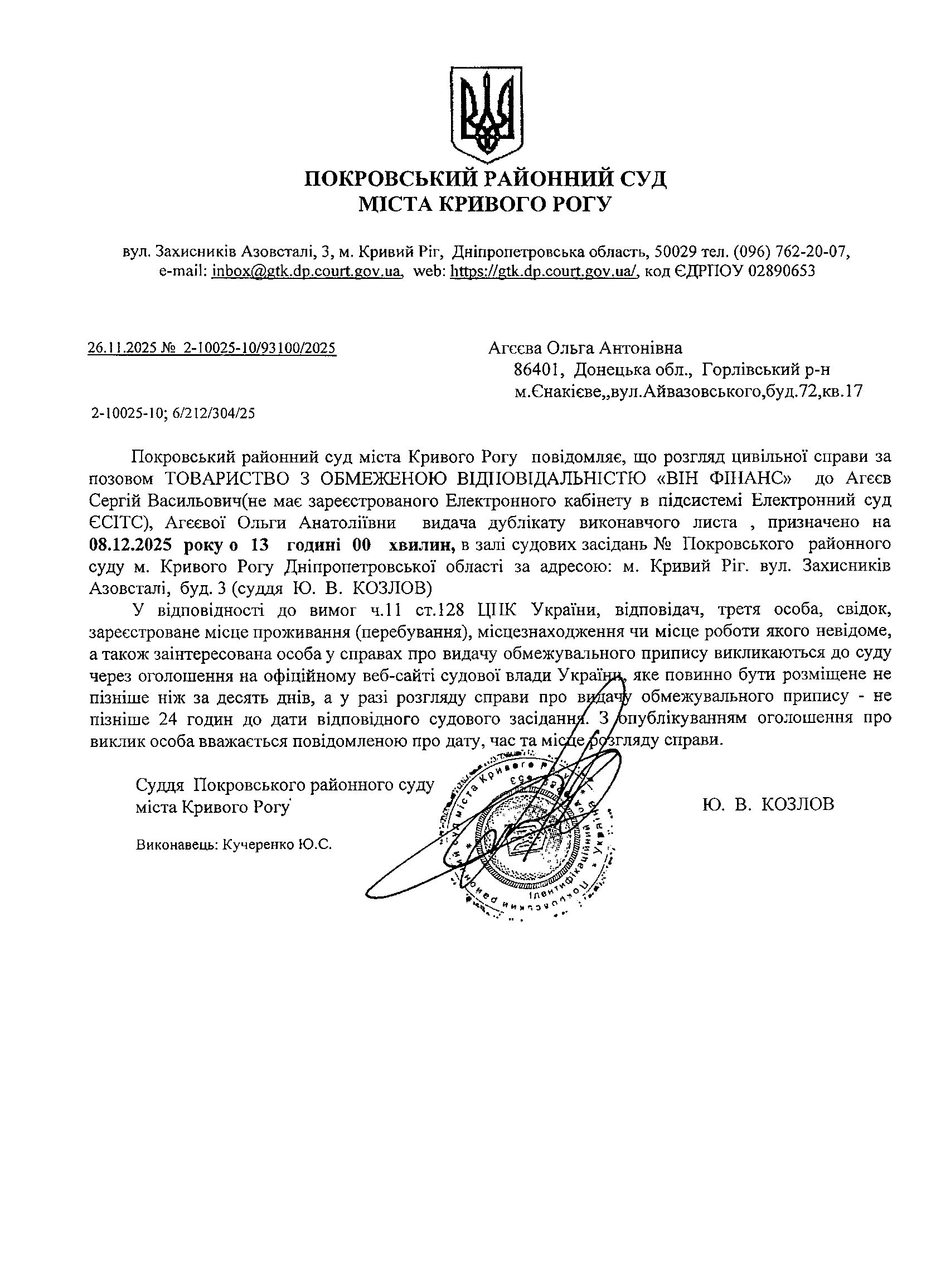 Оголошення про виклик до суду Агєєвої Ольги Антонівни