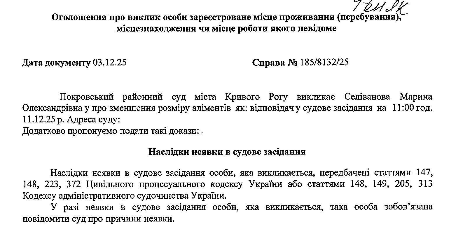 ОГОЛОШЕННЯ ПРО ВИКЛИК ДО СУДУ