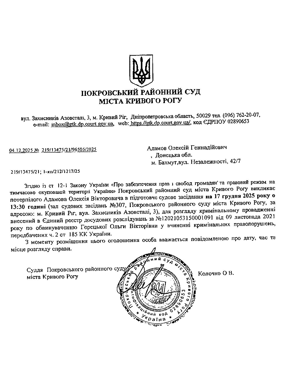 Оголошення про виклик до суду Адамова Олексія Геннадійовича