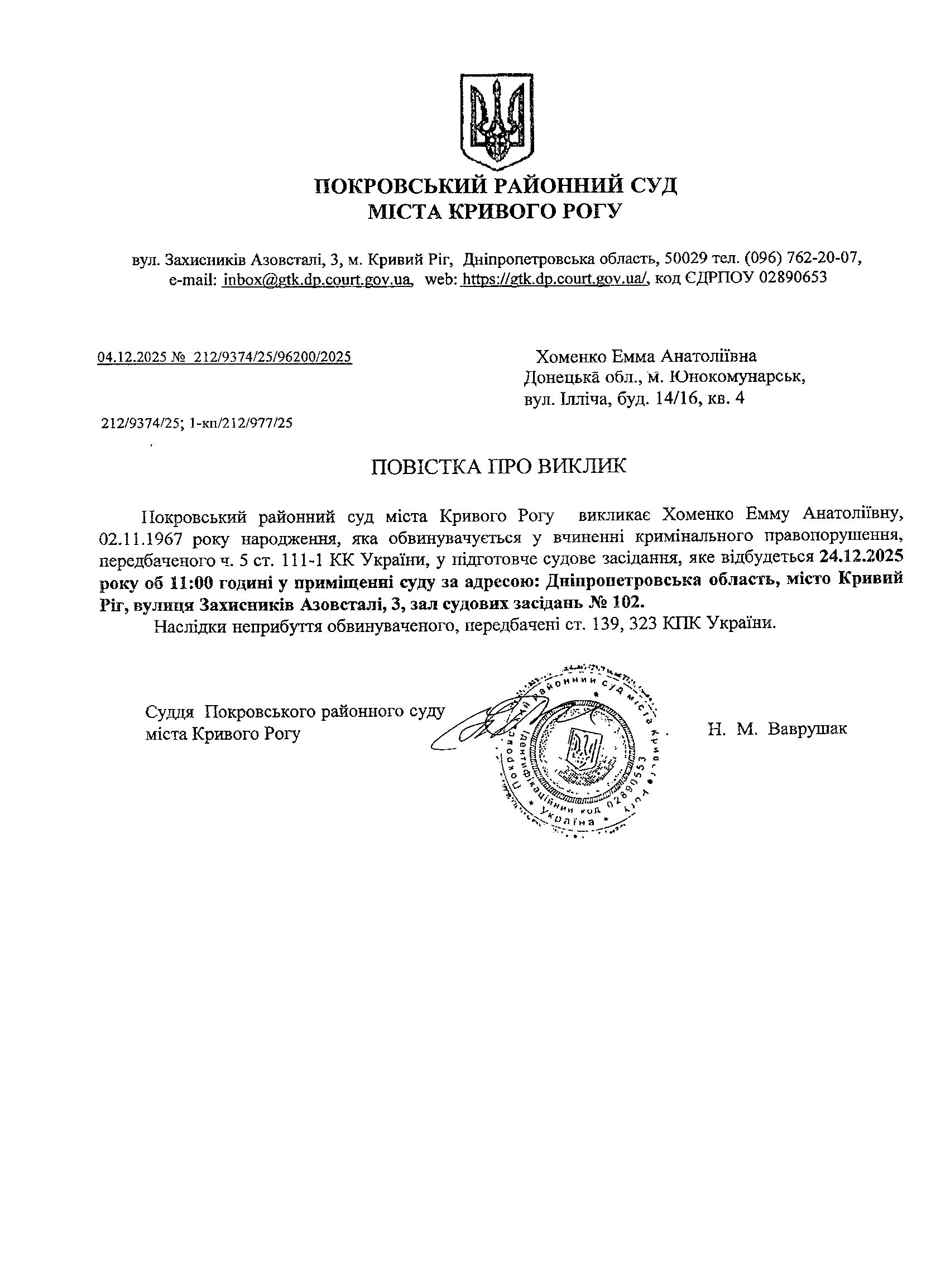 Оголошення про виклик до суду Хоменко Емми Анатоліївни