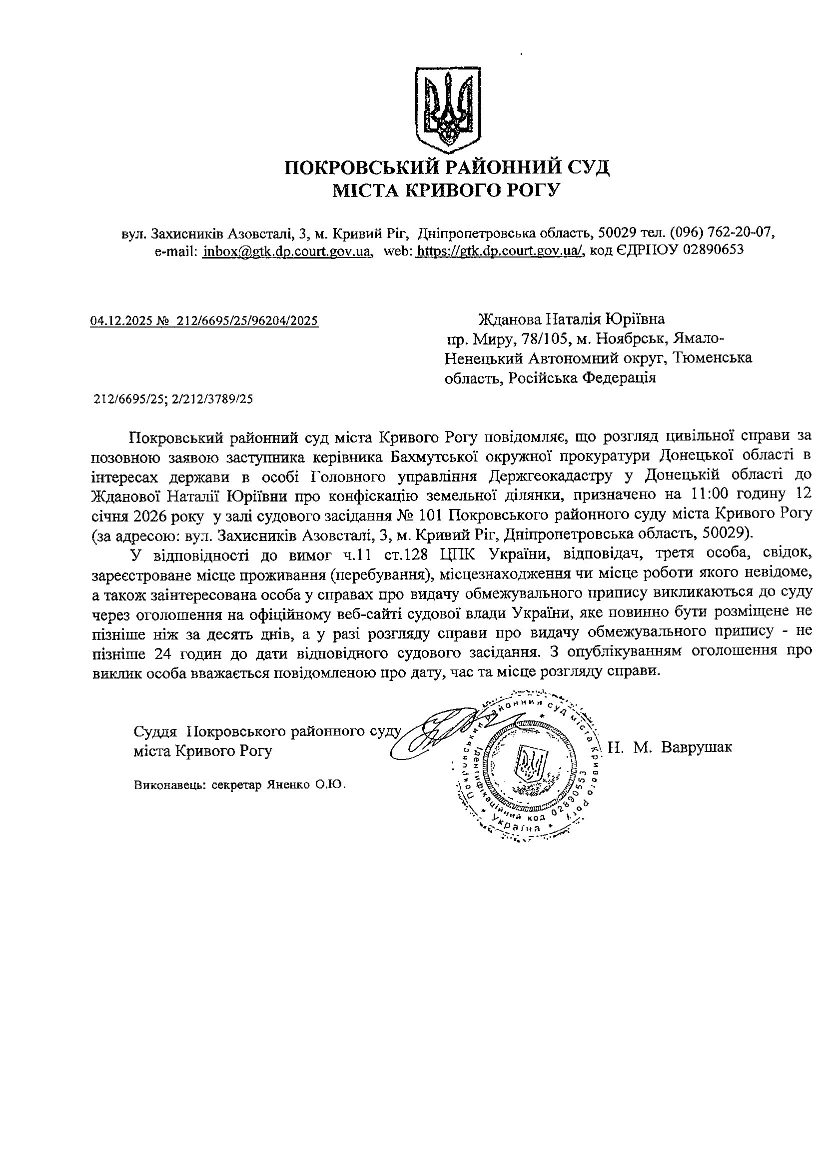 Оголошення про виклик до суду Жданової Наталії Юріївни