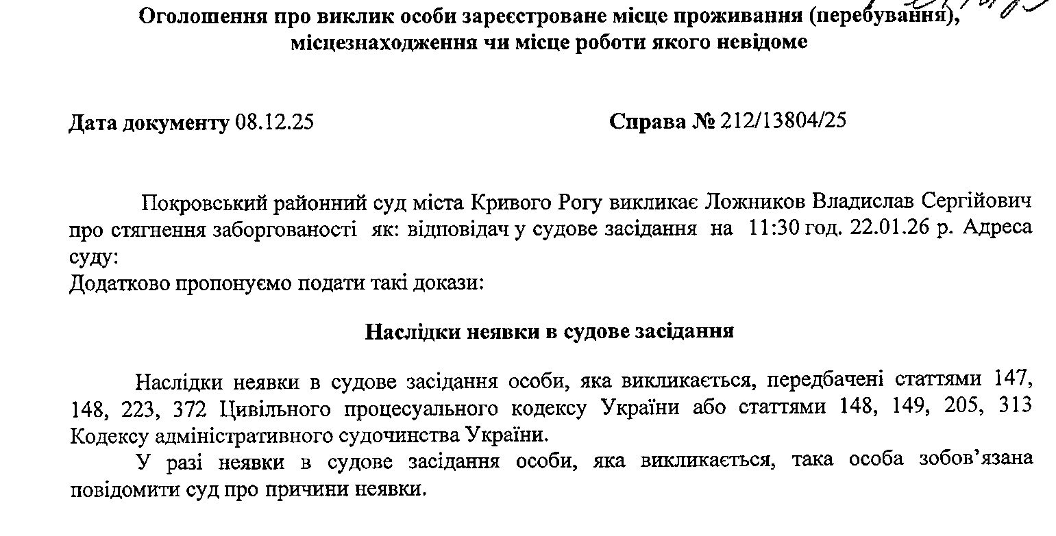 Оголошення про виклик до суду Ложникова Владислава Сергійовича