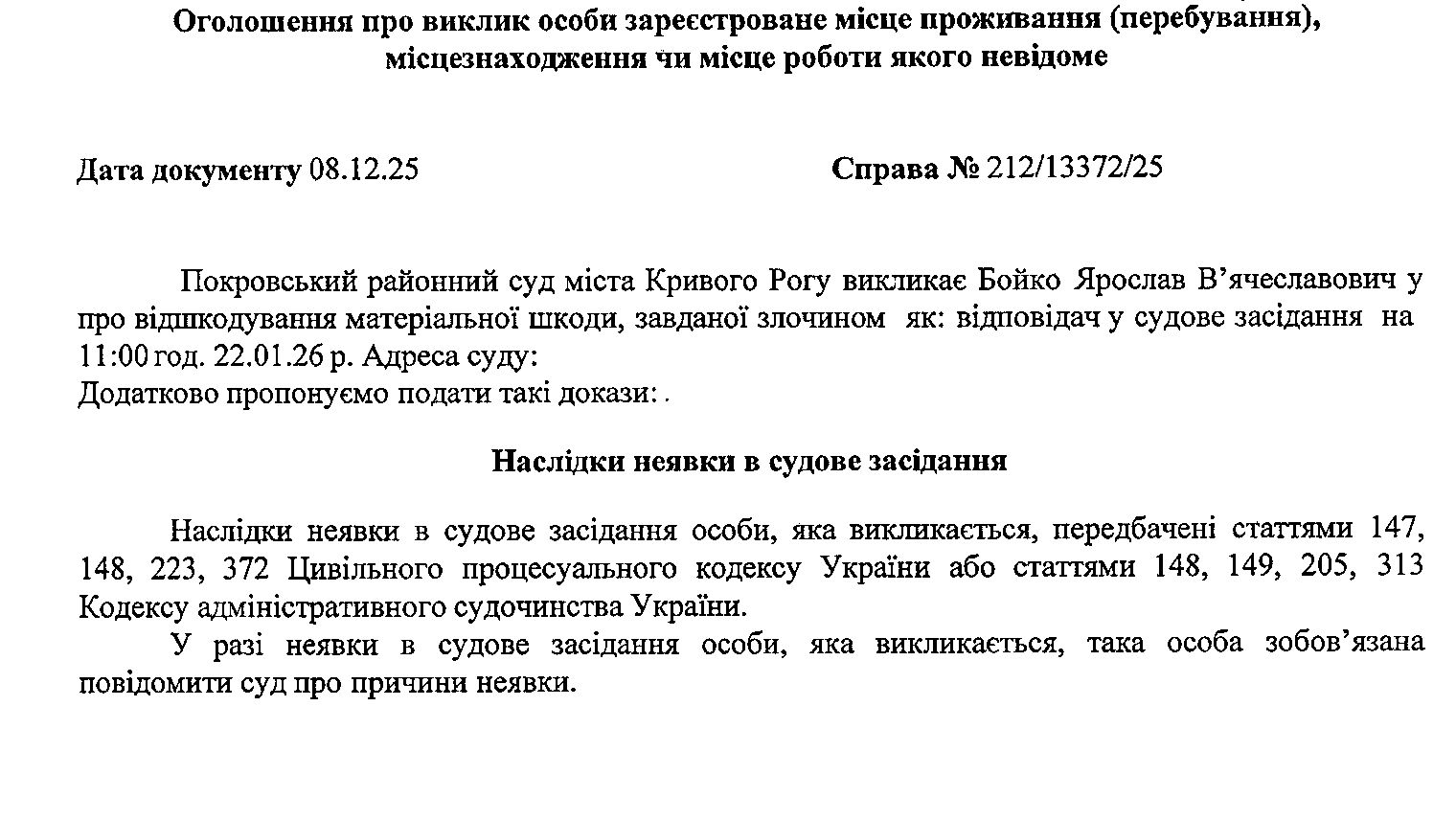 Оголошення про виклик до суду Бойка Ярослава В'ячеславовича