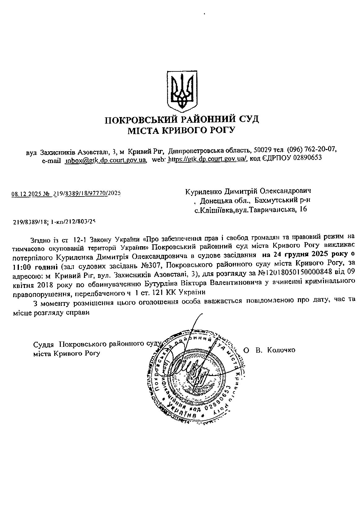 Оголошення про виклик до суду Куриленка Димитрія Олександровича