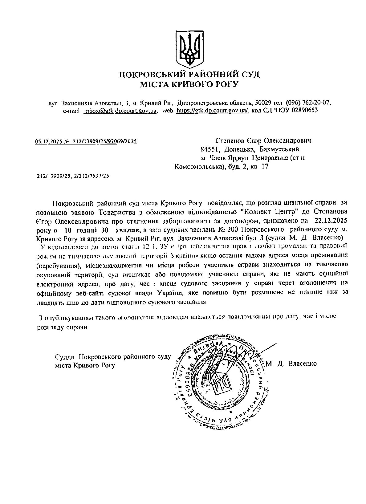 Оголошення про виклик до суду Степанова Єгора Олександровича