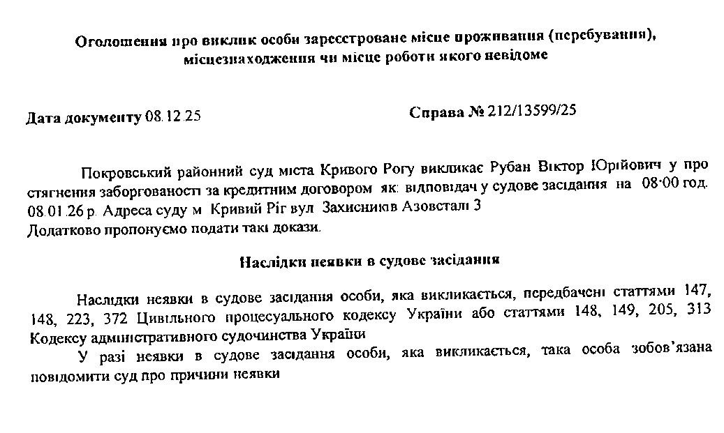 Оголошення про виклик до суду Рубана Віктора Юрійовича