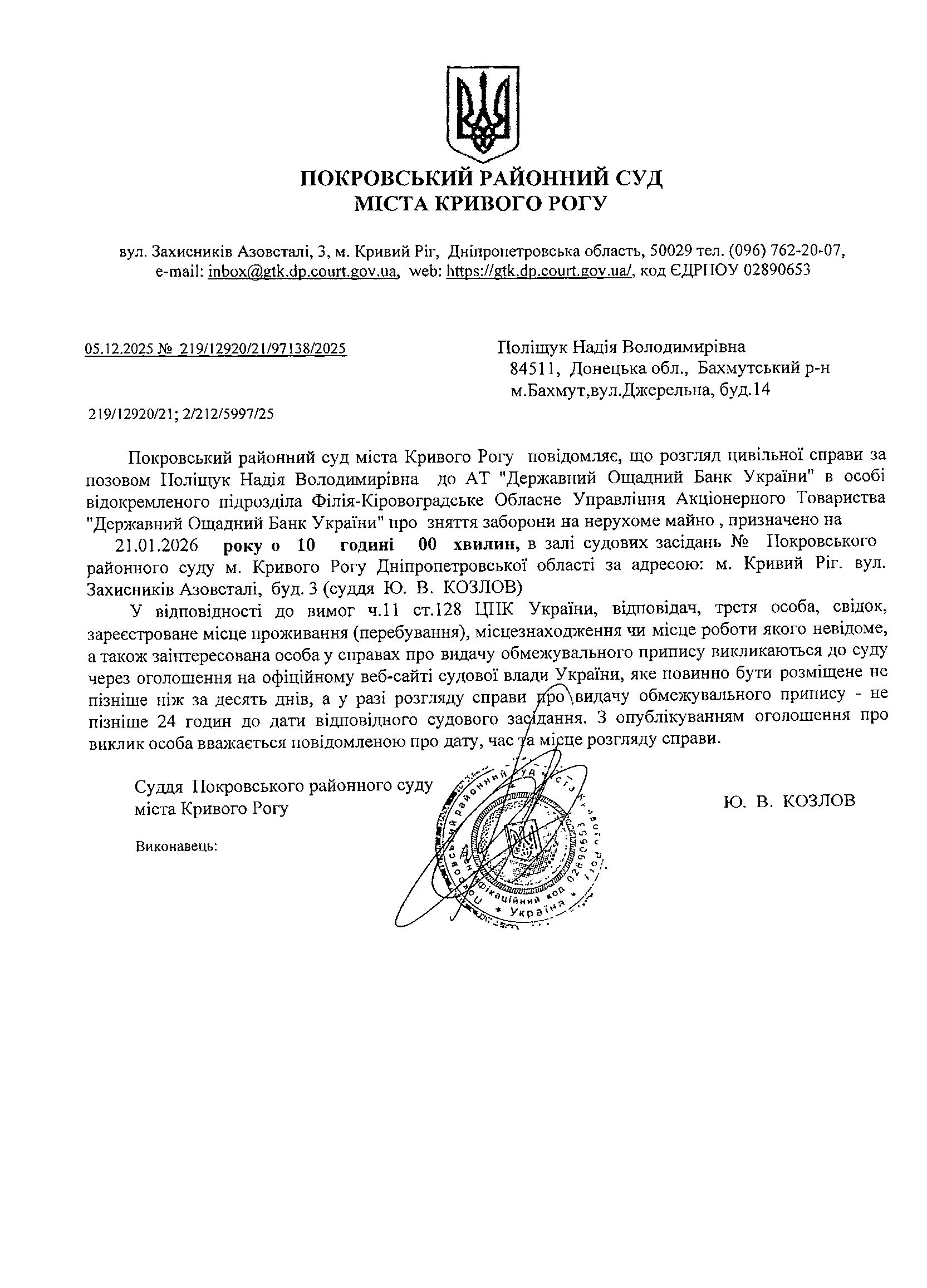 Оголошення про виклик до суду Поліщук Надії Володимирівни
