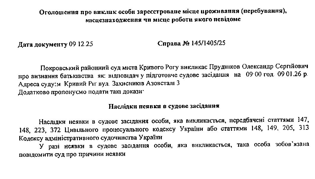 Оголошення про виклик до суду Пруднікова Олександра Сергійовича