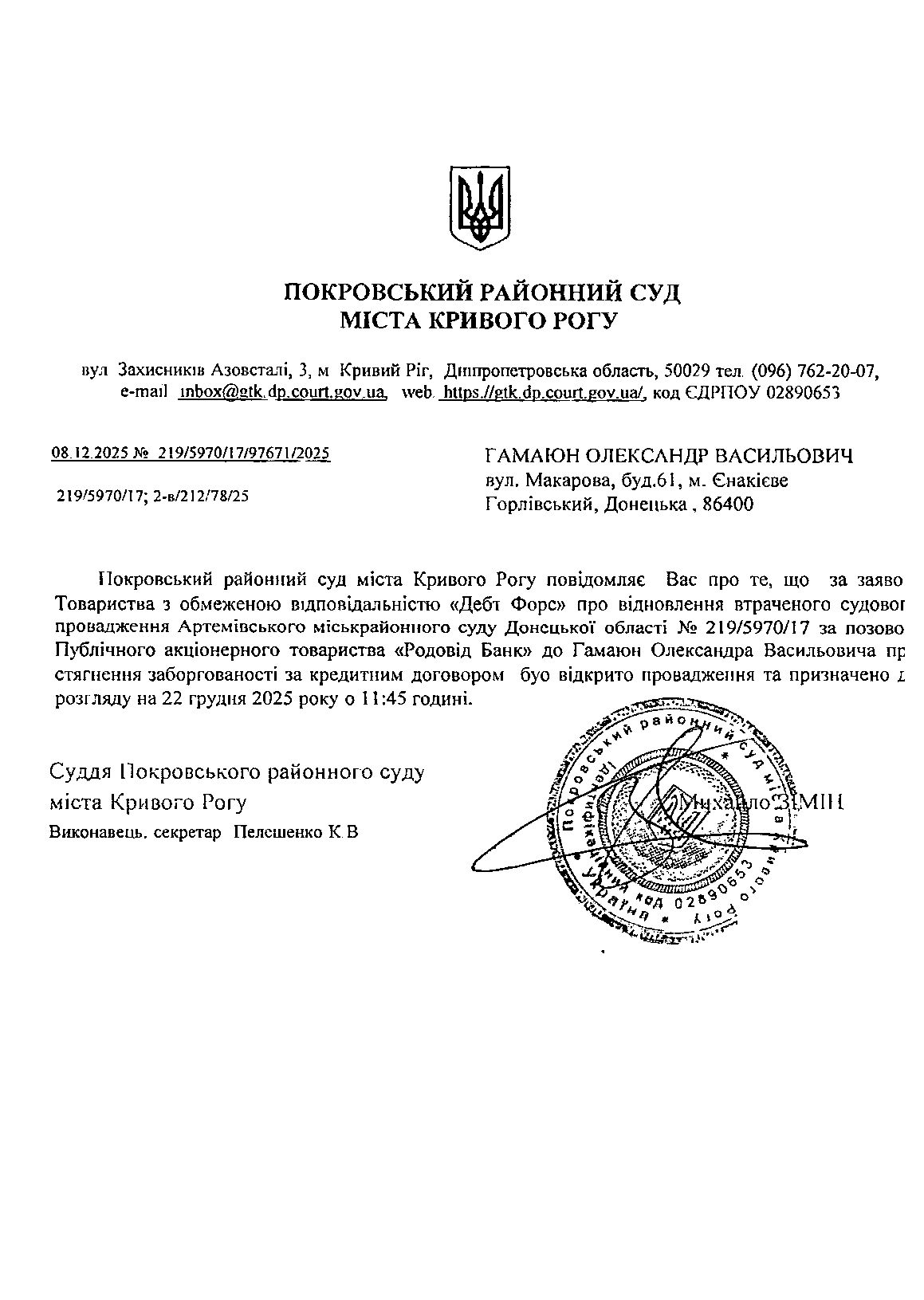 Оголошення про виклик до суду Гамаюна Олександра Васильовича