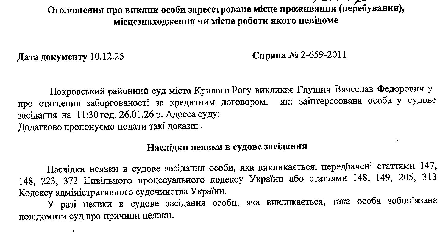 Оголошення про виклик до суду Глушича Вячеслава Федоровиа