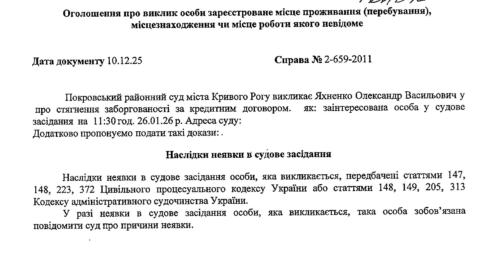 Оголошення про виклик до суду Яхненко Олександра Васильовича