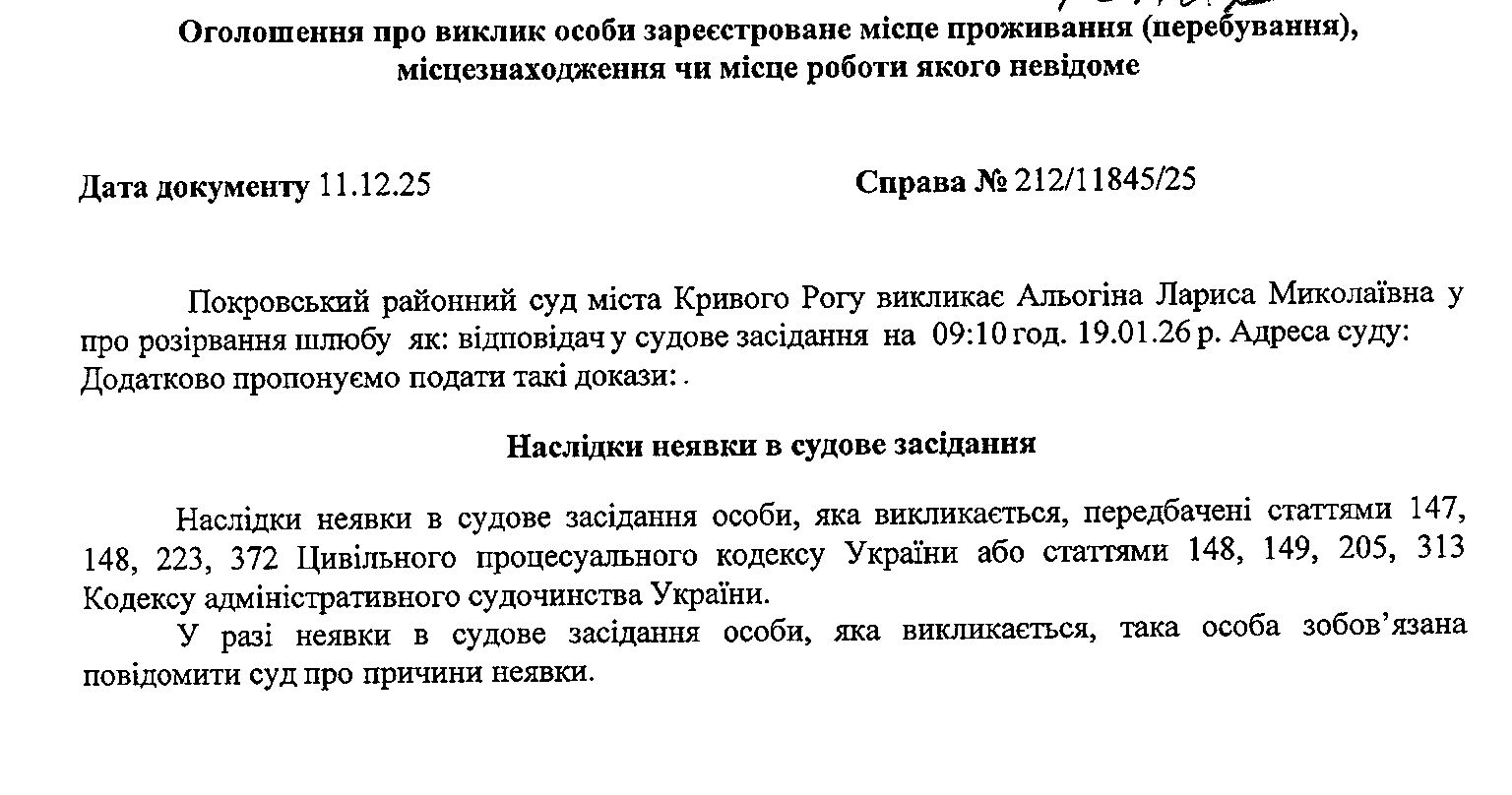Оголошення про виклик до суду Альогіної Лариси Миколаївни