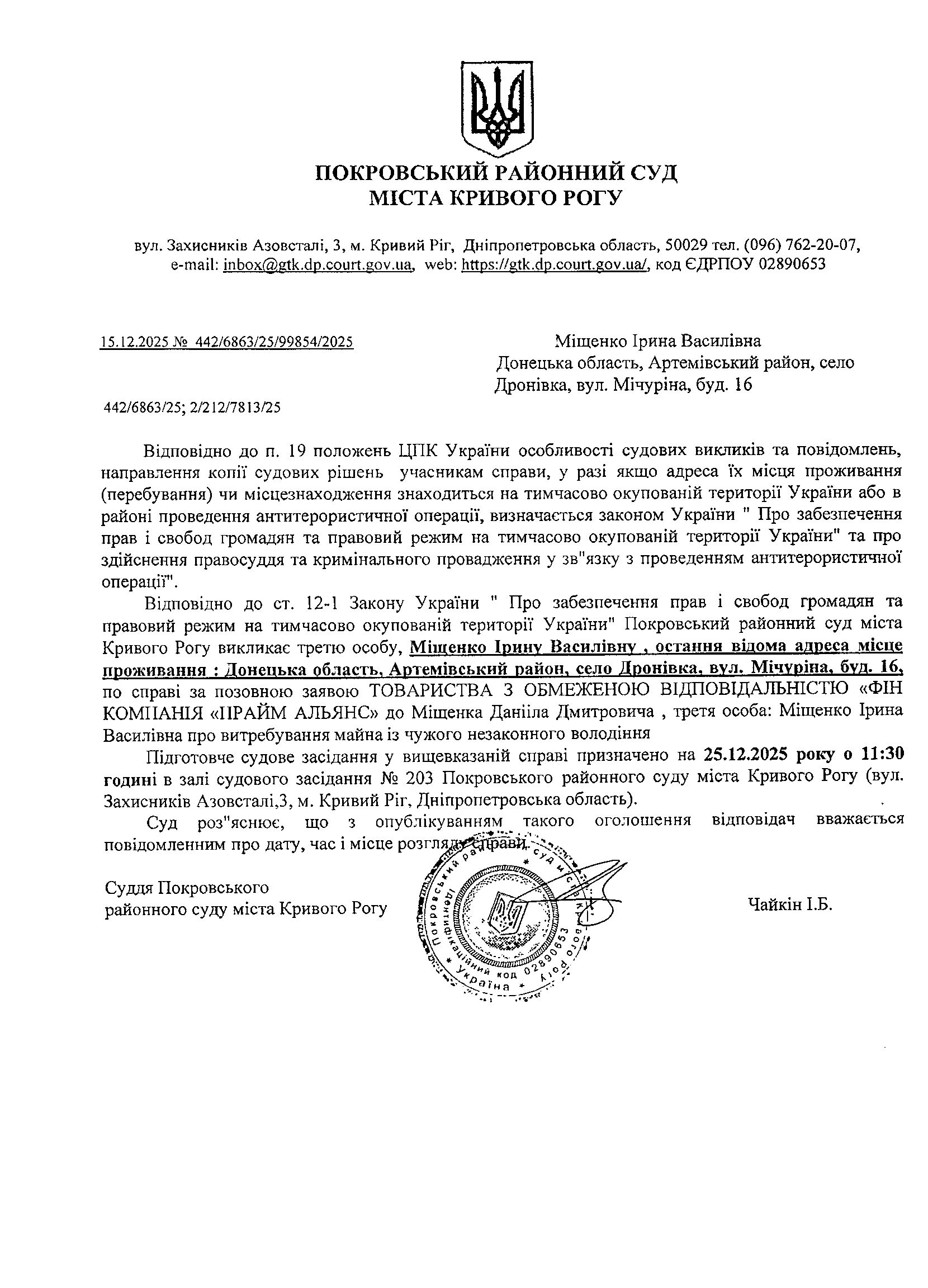 Оголошення про виклик до суду Міщенко Ірини Василівни