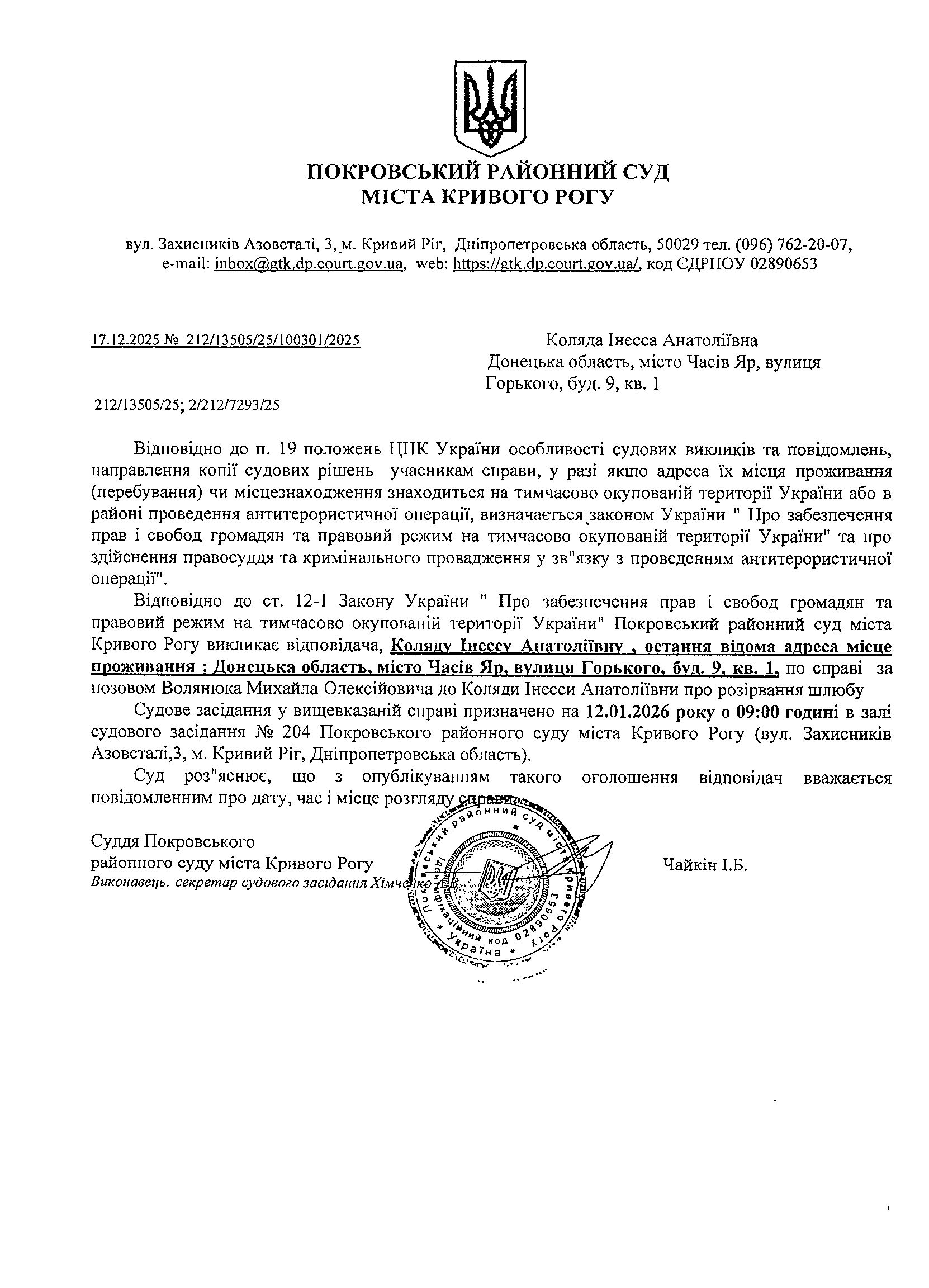 Оголошення про виклик до суду Коляду Інессу Анатоліївну