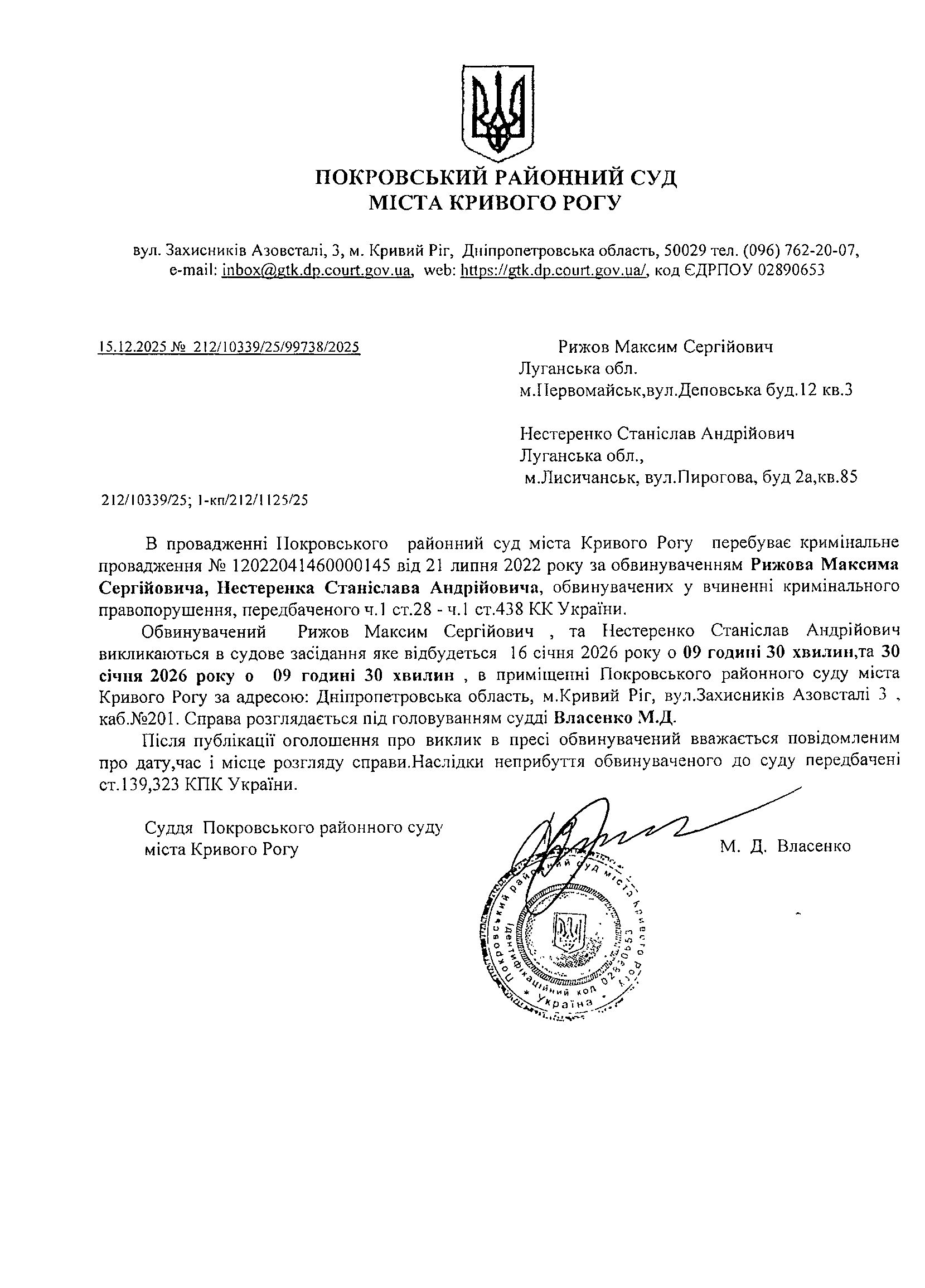 Оголошення про виклик до суду Рижома Маскима Сергійовича та Нестеренко Станіслава Андрійовича