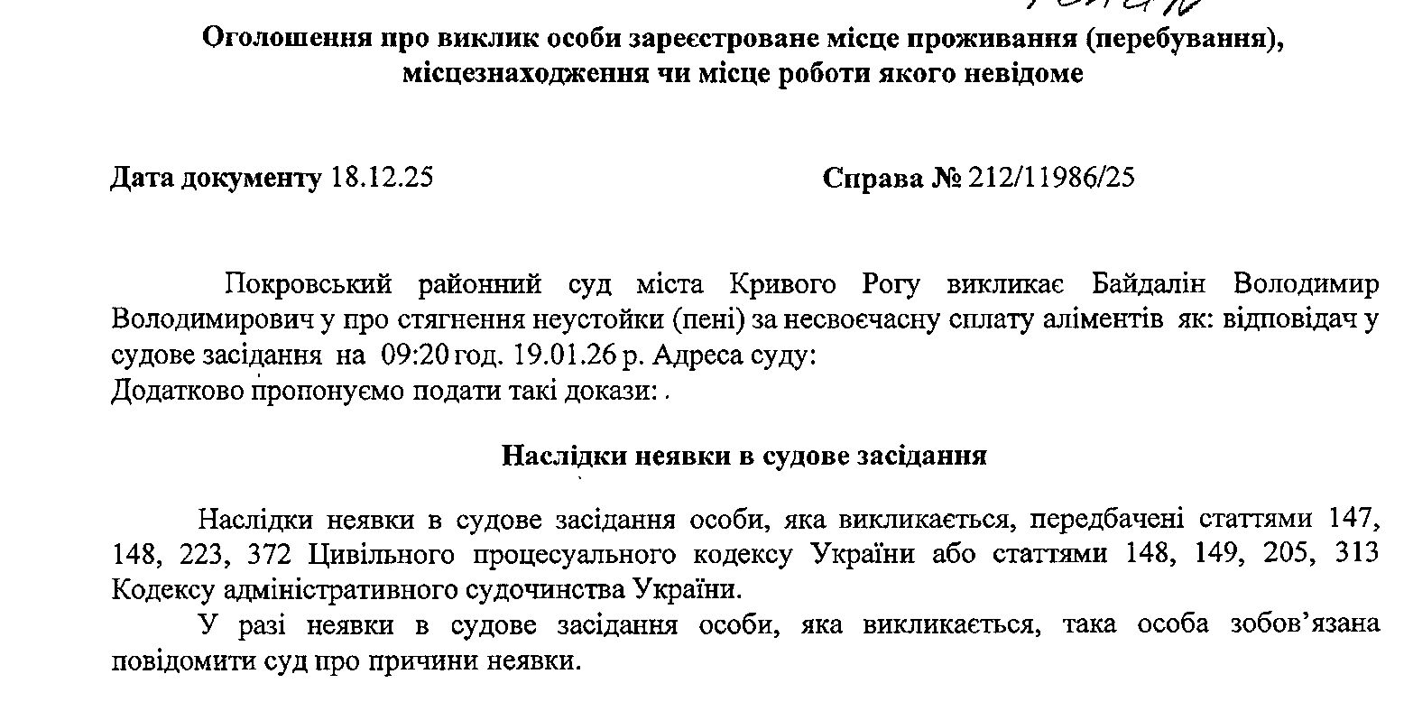 Оголошення про виклик до суду Байдаліна Володимира Володимировича