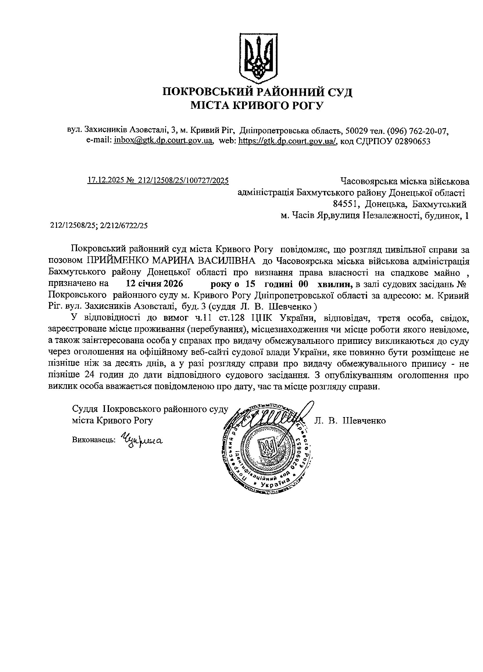 Оголошення про виклик до суду Часовоярської міської військової адміністрації
