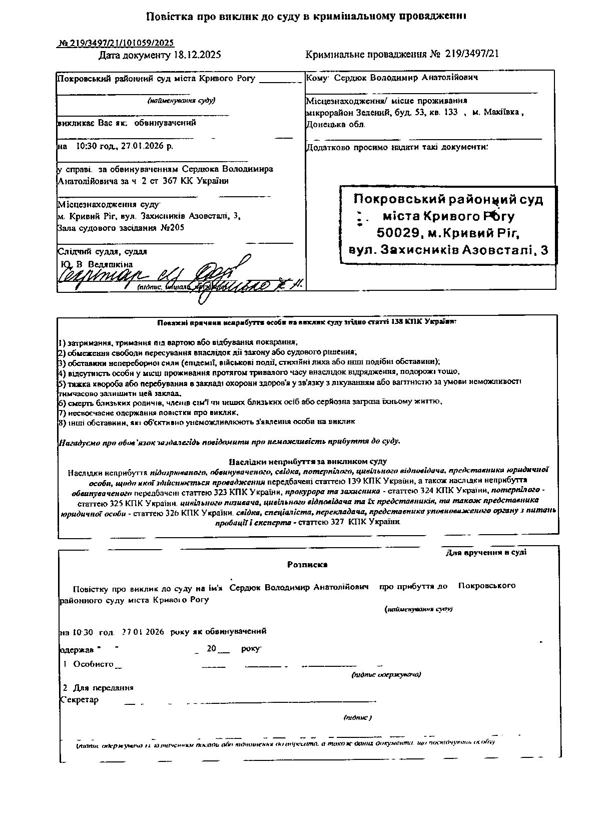 Оголошення про виклик до суду Сердюка Володимира Анатолійовича