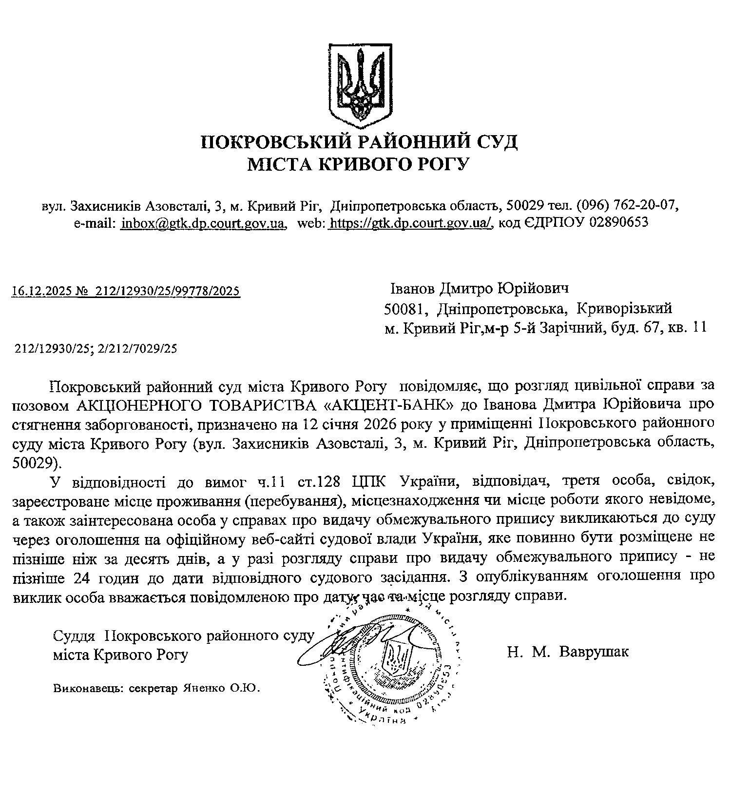 Оголошення про виклик до суду Іванова Дмитра Юрійовича