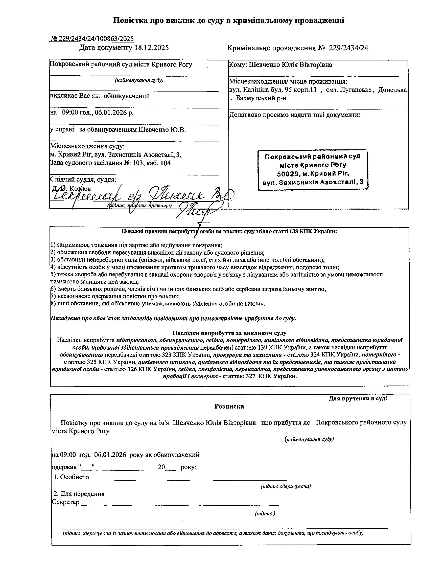Оголошення про виклик до суду Шевченко Юлії Вікторівни