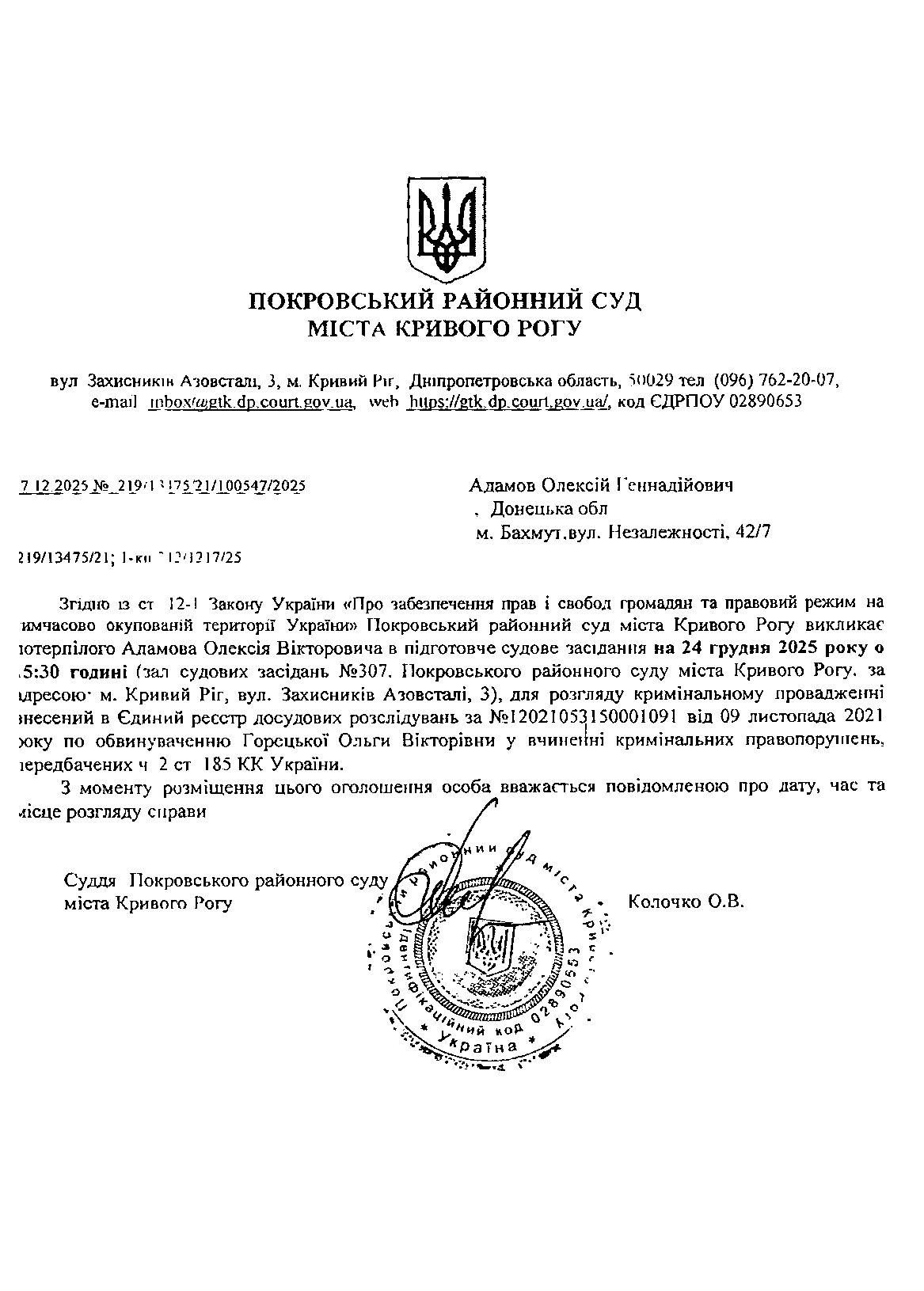 Оголошення про виклик до суду Адамова Олексія Геннадійовича