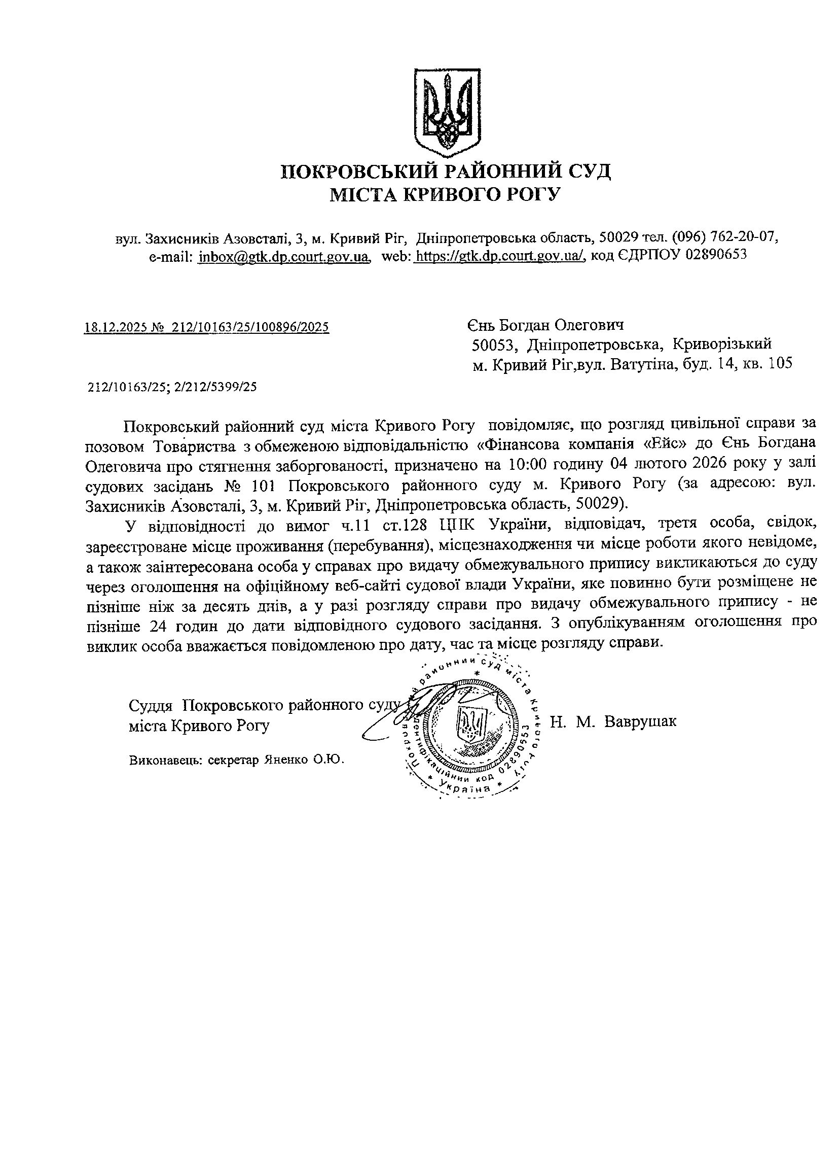 Оголошення про виклик до суду Єнь Богдана Олеговича